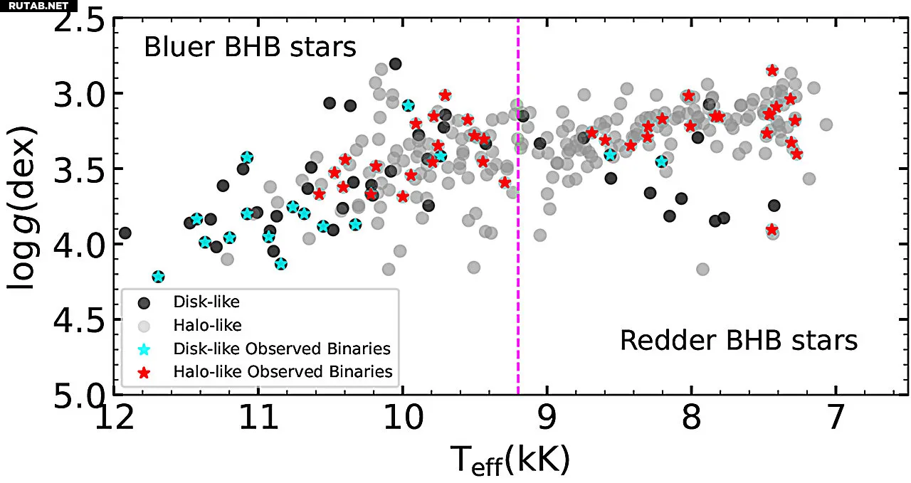 Классификация BHB-звёзд на основе их положений на диаграмме Кила. Пунктирная линия magenta отмечает границу, различающую более красные BHB-звёзды и более голубые BHB-звёзды в плоскости эффективной температуры и поверхностной гравитации. Серые точки представляют BHB-звёзды гало-типа, а чёрные точки обозначают BHB-звёзды дискового типа. Наблюдаемые двойные системы гало-типа (красные звёзды) и дискового типа (голубые звёзды) выделены соответствующим образом. Автор: Astronomy & Astrophysics (2025). DOI: 10.1051/0004-6361/202555002
