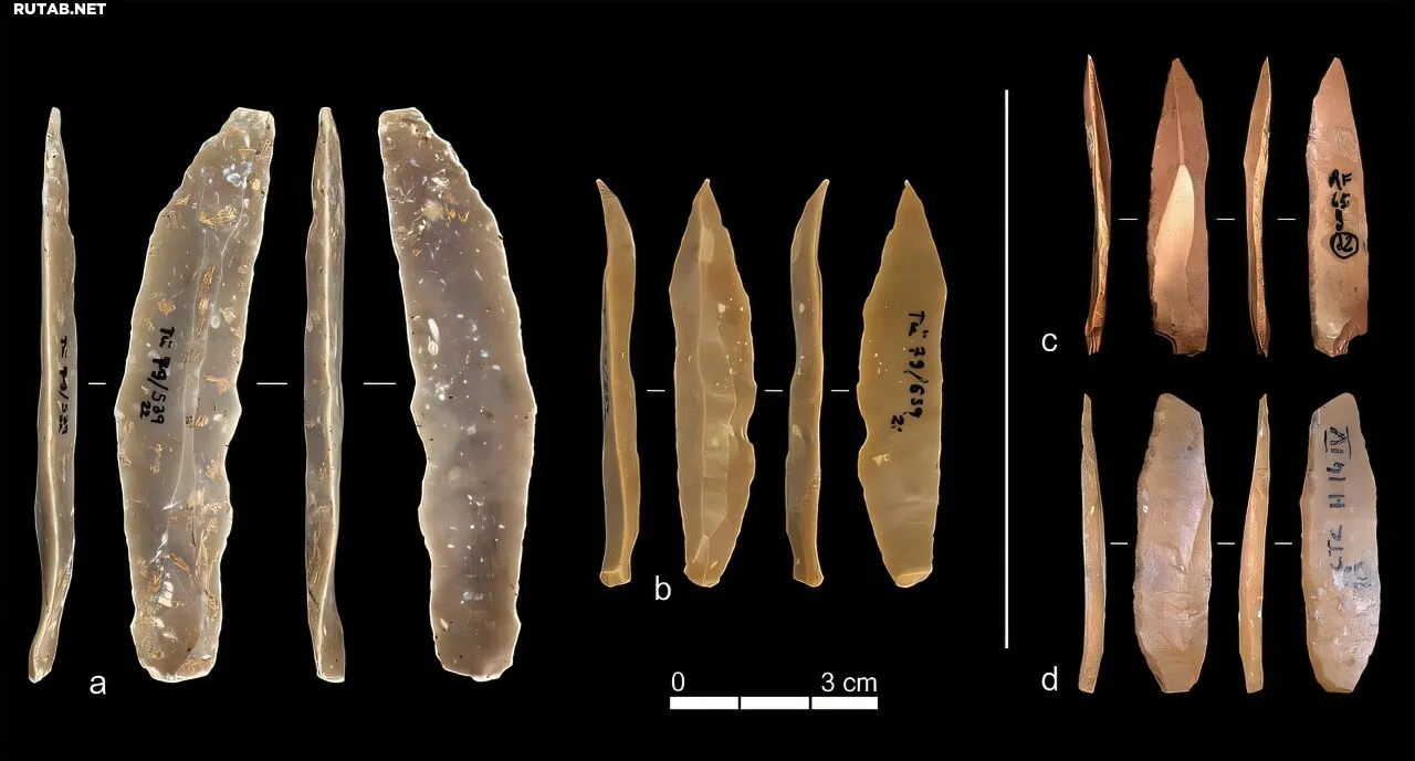 Примеры каменных орудий ахмарийской культуры из Ксар Акила (a & b) и протоориньякской культуры из Гротта ди Фумане (c) и Гротта ди Кастельчивита (d). Фалькуччи и Кун обнаружили, что, несмотря на сходство конечных форм, технологические процессы их изготовления были разными.
