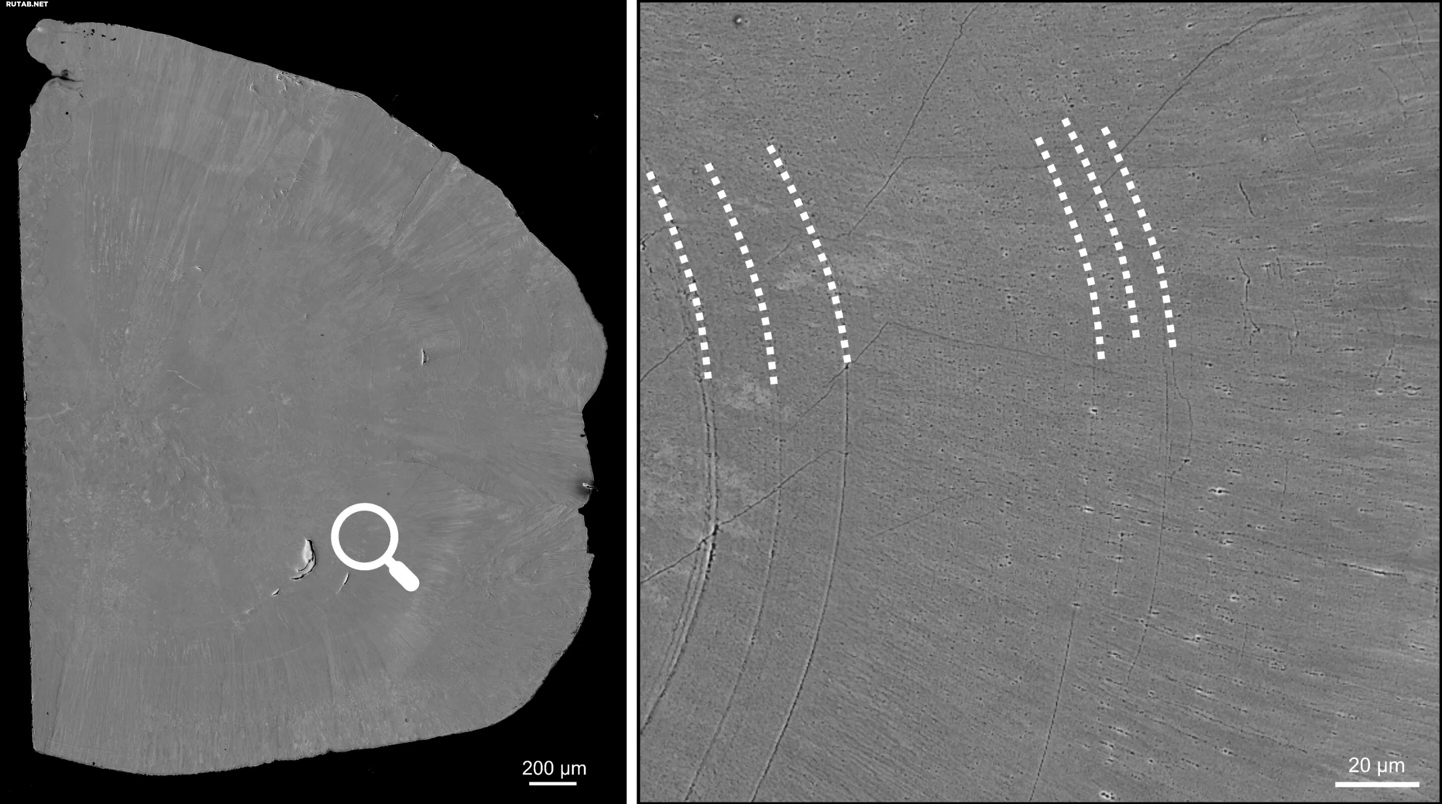 Ископаемый отолит под электронным микроскопом. Слева: обзорное изображение; справа: высокоразрешающий снимок. Пунктирные линии отмечают потенциальные суточные приросты. Между ними видны множество очень тонких микроприростов, которые могут иметь внутрисуточное происхождение. Автор: Изабелла Леонхард