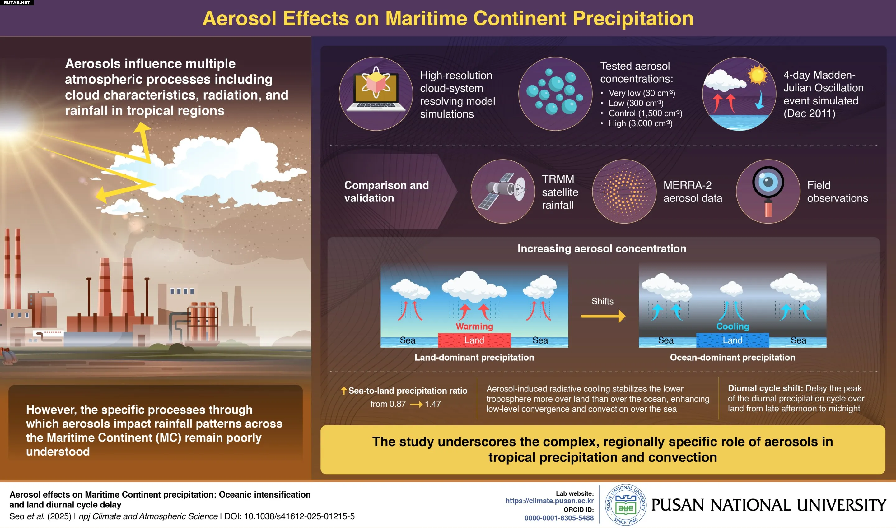 Используя атмосферную модель с высоким разрешением и данные спутников NASA, учёные обнаружили, что высокие концентрации аэрозолей усиливают дожди над океаном на 50%, одновременно ослабляя их над сушей. Это смещает баланс осадков с «преобладания над сушей» на «доминирование над океаном».