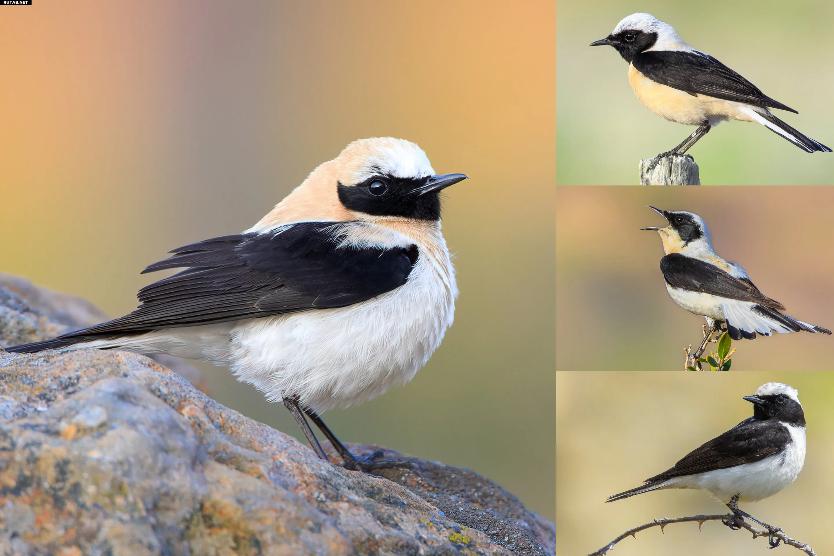 Самцы каменок из комплекса Oenanthe hispanica. Слева — западная черноухая каменка (O. hispanica). Сверху и посередине справа — черногорлая и белогорлая восточная черноухая каменка (O. melanoleuca). Внизу справа — пегая каменка (O. pleschanka). Автор: Рето Бурри