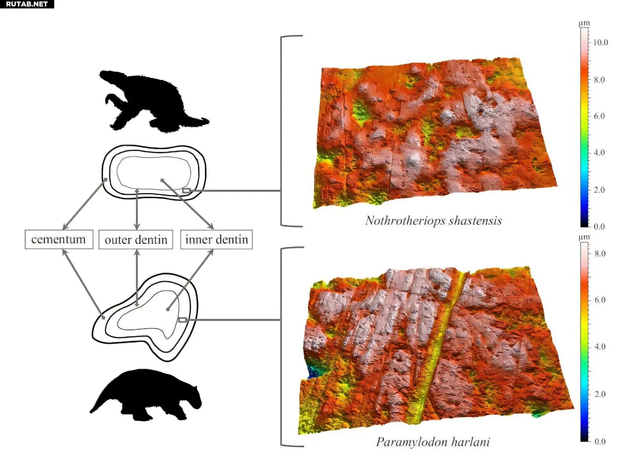 Зубы ленивца Харлана (внизу) демонстрируют более глубокие ямчатые текстуры, в то время как у ленивца Шаста (вверху) наблюдаются более мелкие узоры износа. Автор: DeSantis and Kurre, Biology Letters 2025
