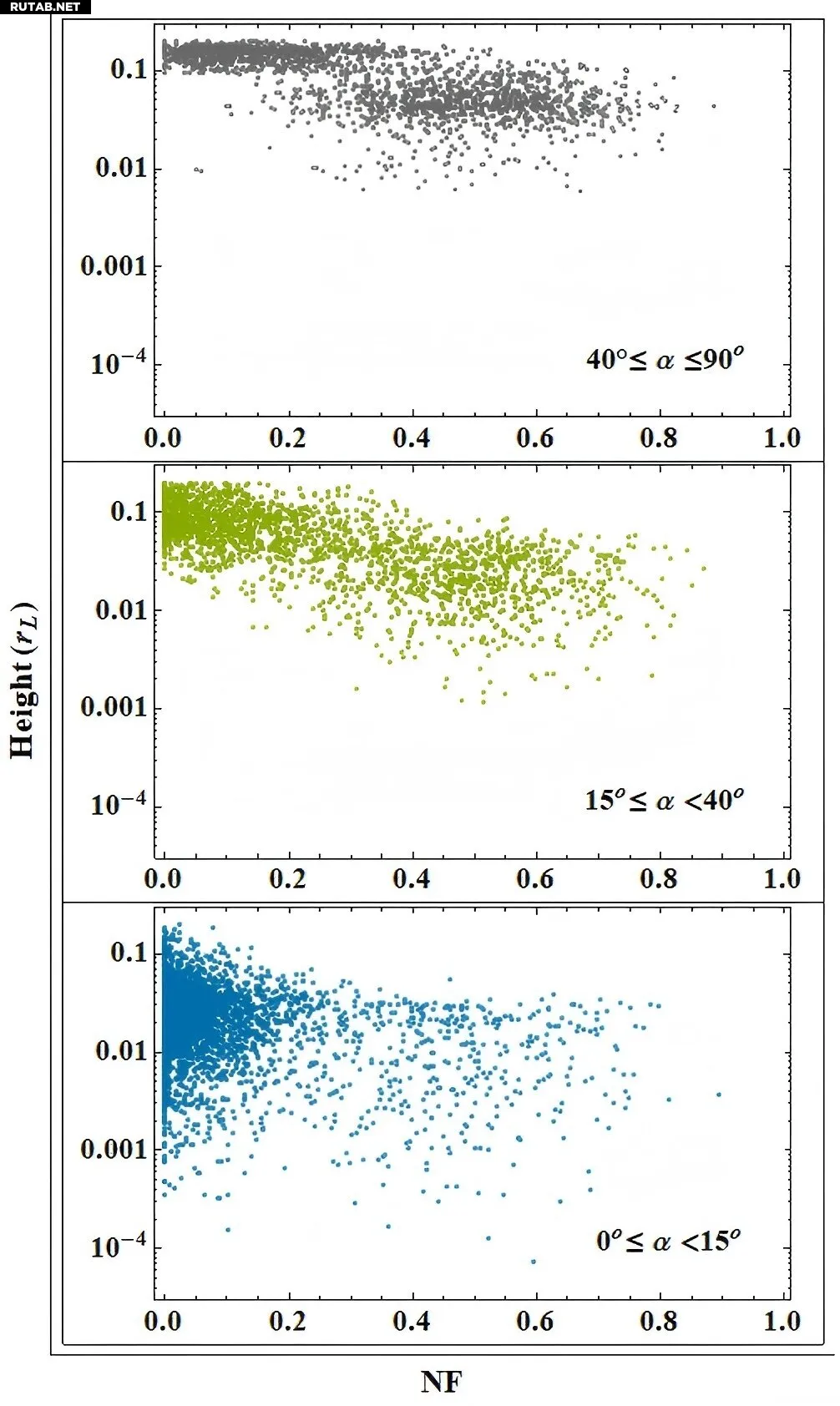 Диаграммы рассеяния, показывающие распределение доли замираний (NF) в зависимости от высоты (rL) для трёх различных диапазонов углов наклона. Каждая диаграмма представлена в одном и том же логарифмически-линейном масштабе. Автор: XAO