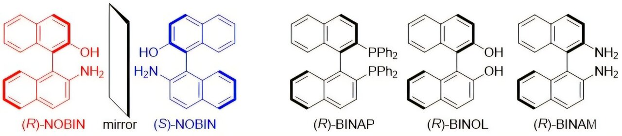 Представительные аксиально хиральные органические молекулы: NOBIN, BINAP, BINOL, BINAM. Автор: ACS Catalysis (2025). DOI: 10.1021/acscatal.5c05038