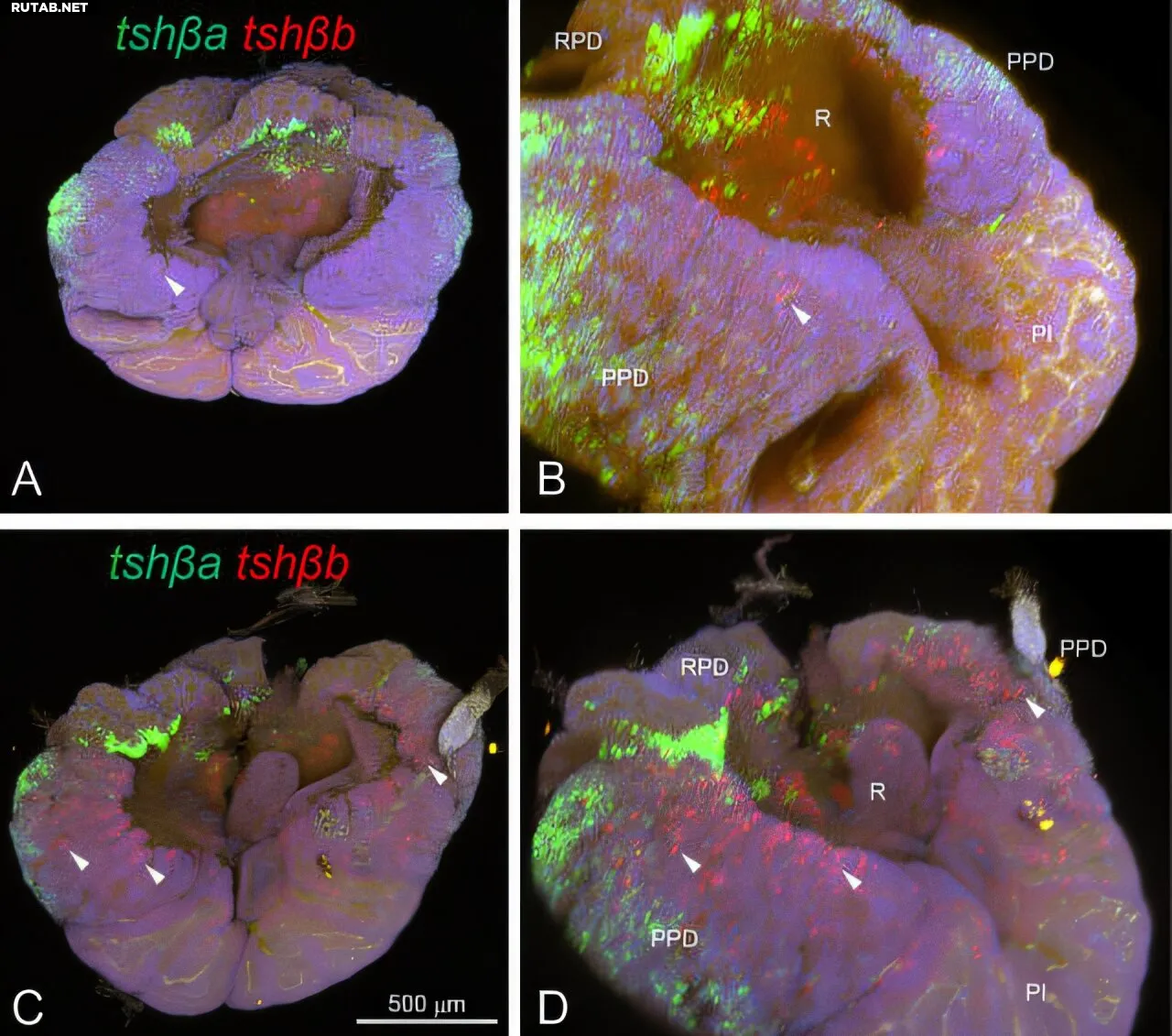 При воздействии дневного света на гипофиз лосося в нём активируется ТТГ (красный и зелёный цвета). Автор: Стивен Маккормик.
