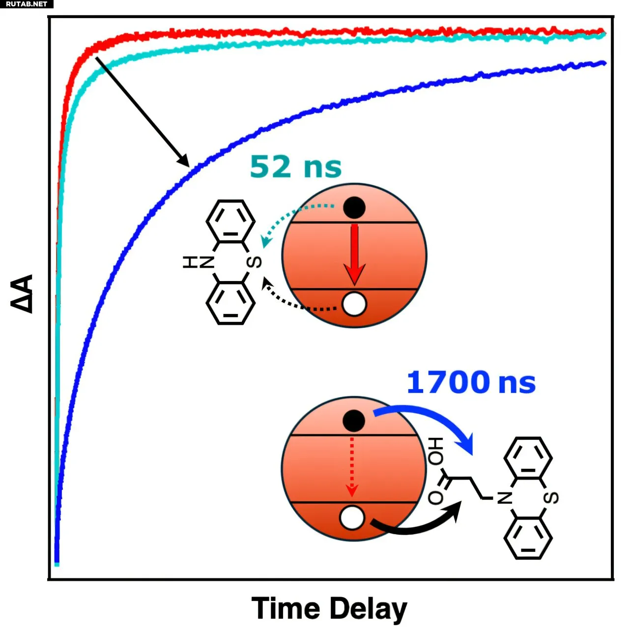 Чтобы решить эту проблему, команда создала «молекулярную плотину» на основе производного фенотиазина. Молекула имеет две ключевые особенности: карбоксилатную группу, которая прочно связывается с поверхностью нанокристалла, и структуру, быстро принимающую положительный заряд («дырку»).