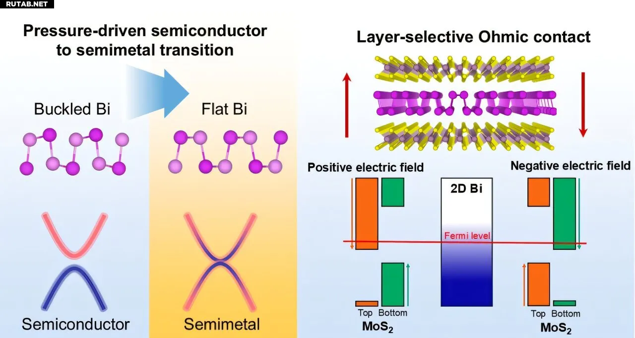 Атомарно тонкий висмут в форме монослоя является полупроводником, но может быть преобразован в металл (или полуметалл) под действием внешнего давления. Трехслойная гетероструктура, состоящая из такого металлического висмута и MoS2, может использоваться для создания послойного омического контакта, в котором электрический ток можно переключать между двумя различными слоями MoS2 с помощью внешнего электрического поля. Автор: SUTD