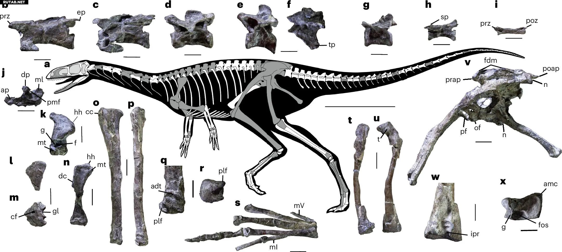 Скелетная анатомия карнийского теропода A. crurilongus. Автор: Nature Ecology & Evolution (2025). DOI: 10.1038/s41559-025-02868-4