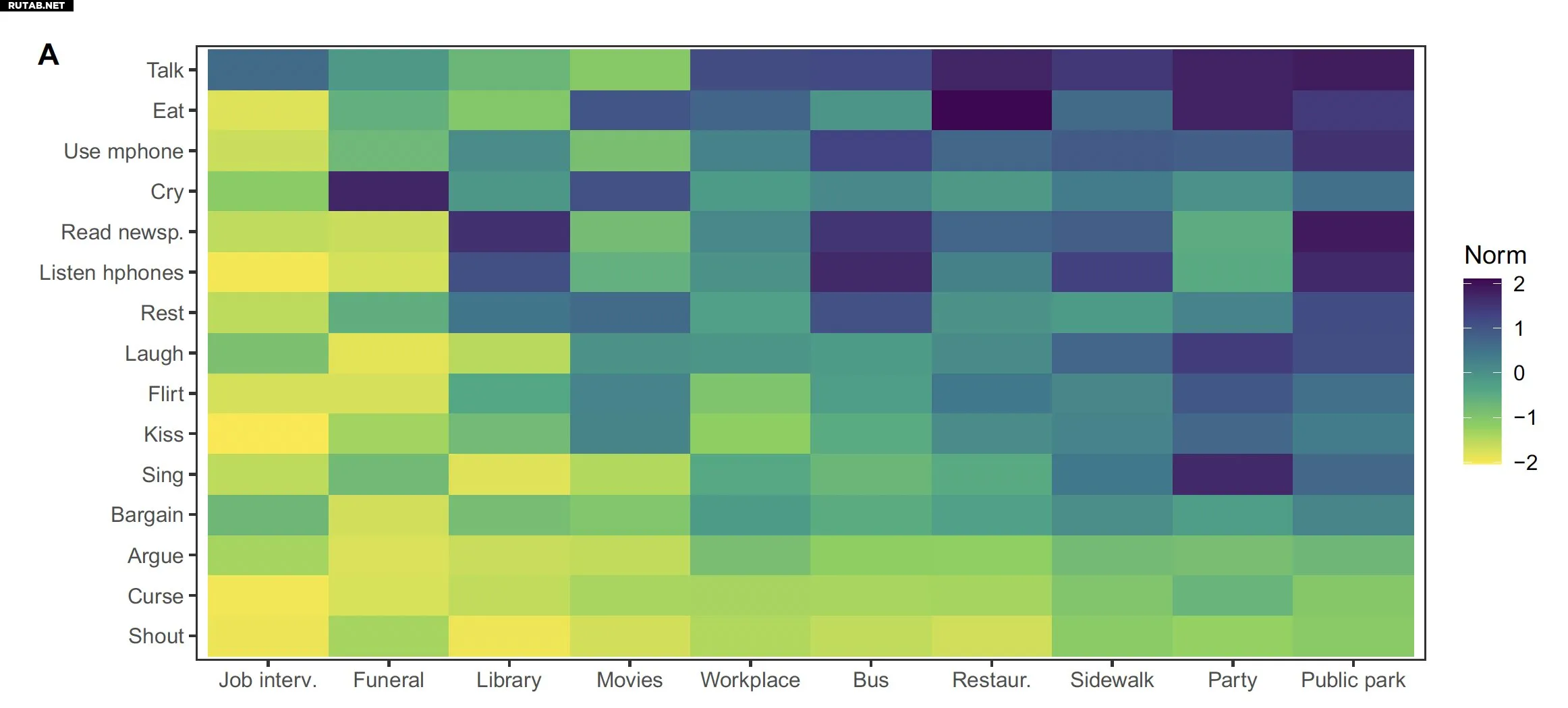 Поведенческие и ситуационные глобальные повседневные нормы. Цветовая матрица, иллюстрирующая глобальные оценки уместности (усредненные по 71 обществу) пятнадцати моделей поведения в каждой из десяти ситуаций. Автор: Эрикссон и др. (Communications Psychology, 2025).
