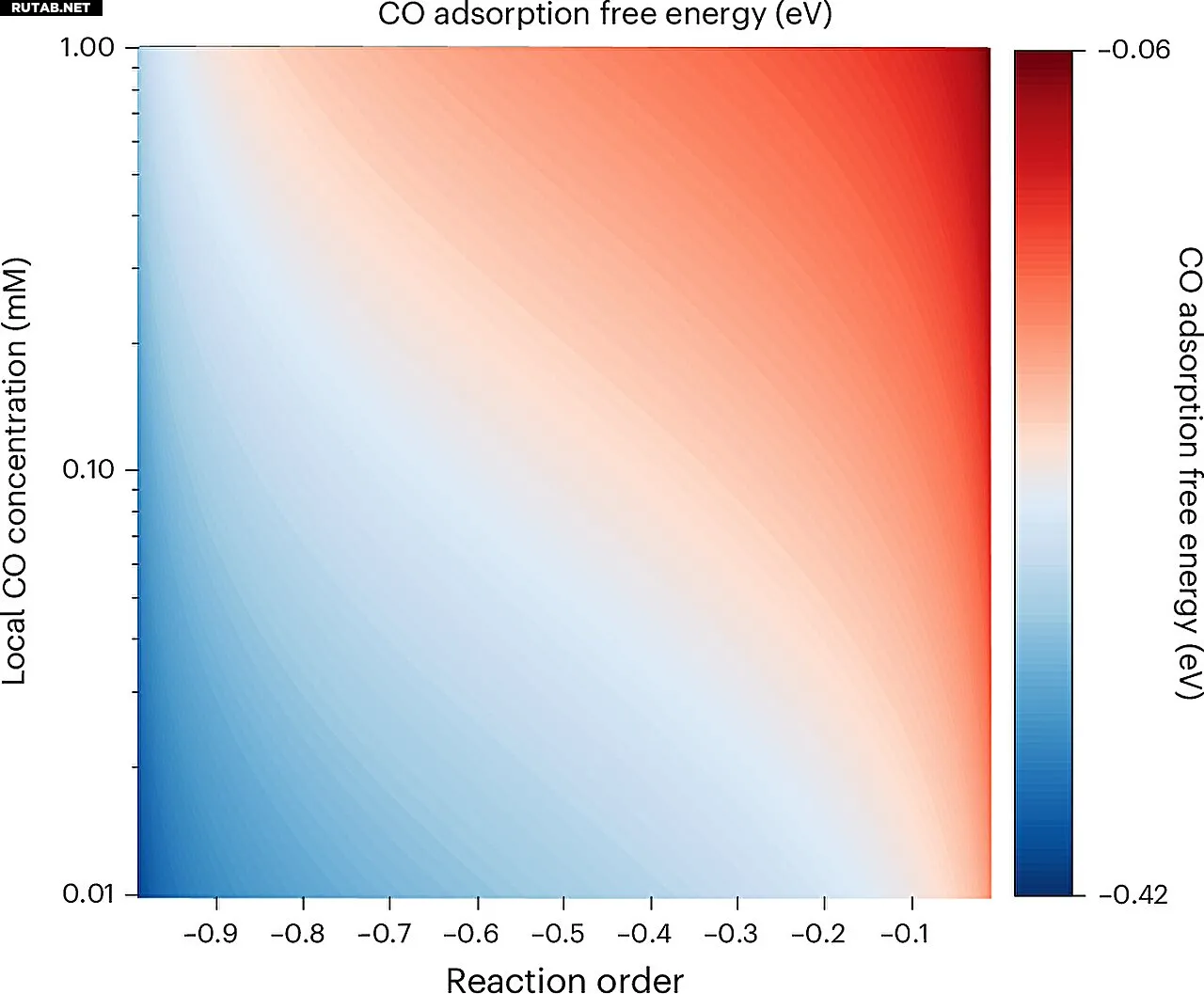 Связь между свободной энергией адсорбции CO, порядком реакции CO и локальной концентрацией CO, рассчитанная по уравнению при 298 К. Автор: Nature Catalysis (2025). DOI: 10.1038/s41929-025-01427-1