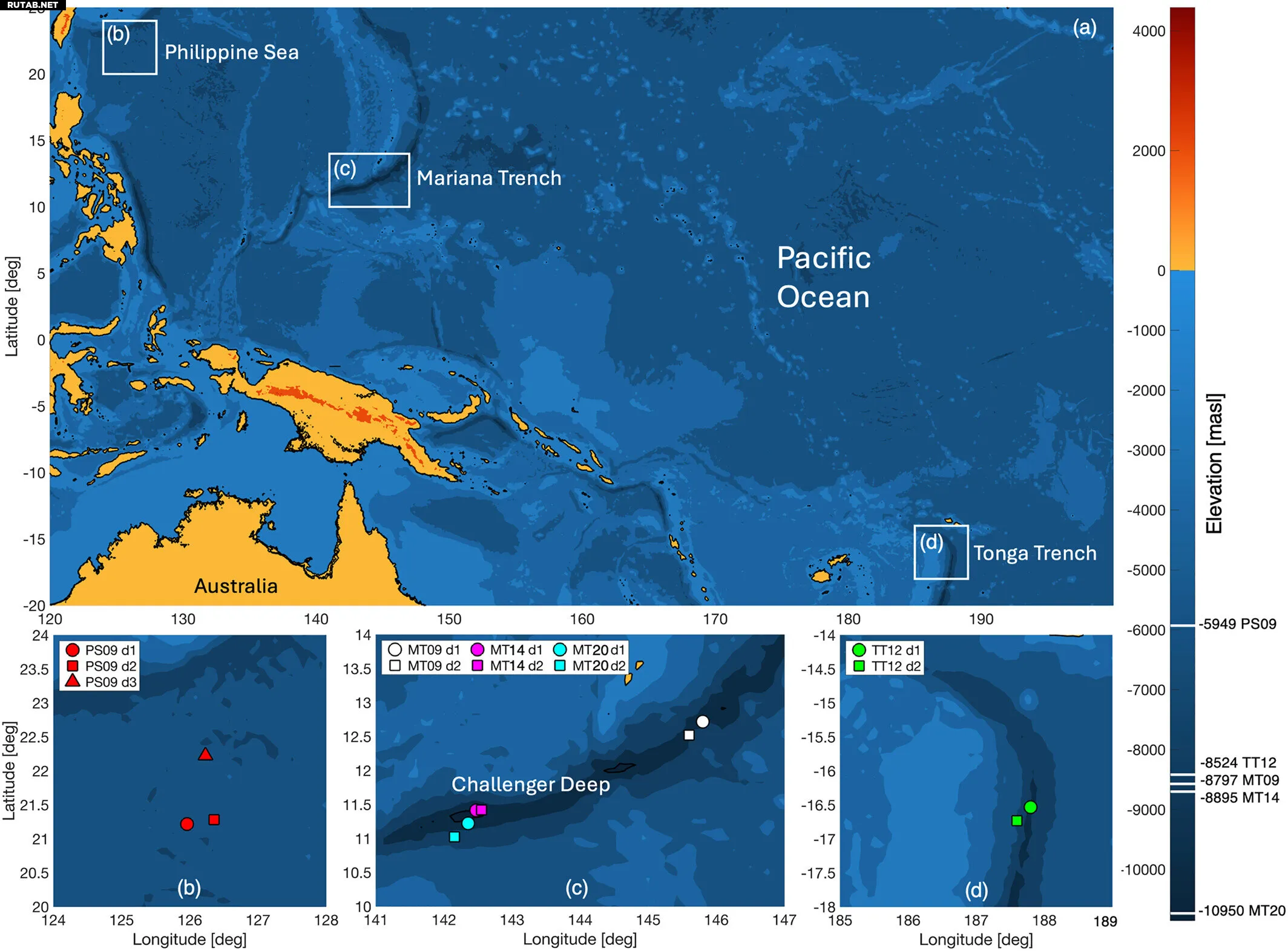 Исследователи использовали автономные акустические профилографы в Филиппинском море, Марианской и Тонга впадинах. Данные собирались более десяти лет в частотном диапазоне 1–10 кГц, где основной шум создается ветром на поверхности океана.