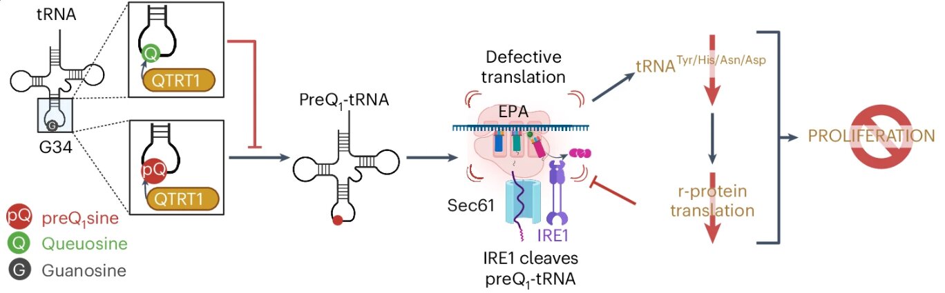 Команда также раскрыла молекулярный механизм действия preQ1. Попадая внутрь клетки, preQ1 конкурирует с квеуином за тот же фермент QTRT1/QTRT2, который модифицирует тРНК. Однако тРНК, модифицированные preQ1, нестабильны и поэтому распознаются как faulty и уничтожаются клеточным ферментом контроля качества IRE1.