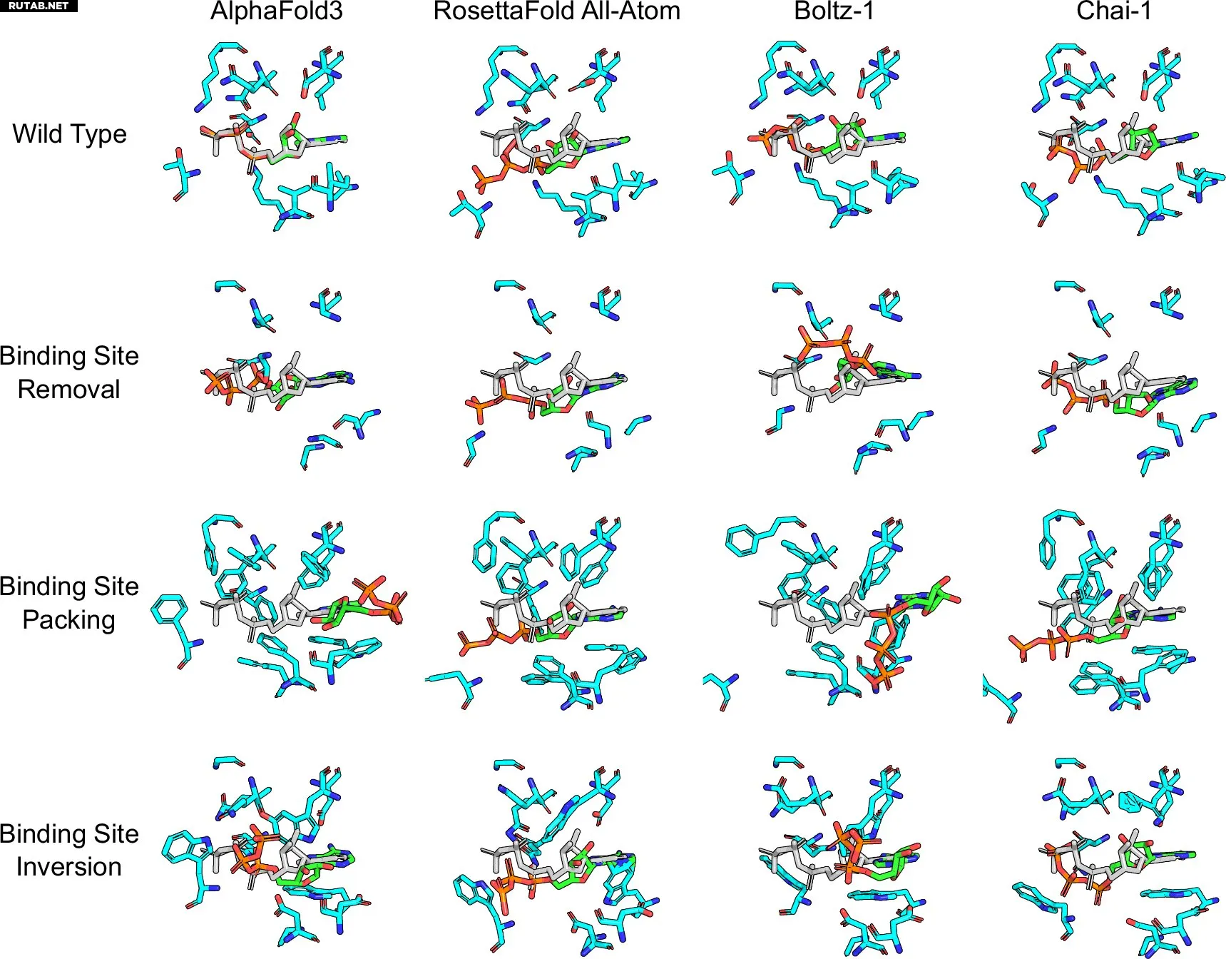 Исследователи модифицировали аминокислотные последовательности сотен образцовых белков так, что сайты связывания для их лигандов имели совершенно другое распределение заряда или были полностью заблокированы. Несмотря на это, ИИ-модели предсказывали ту же самую структуру комплекса — как будто связывание всё ещё было возможным.