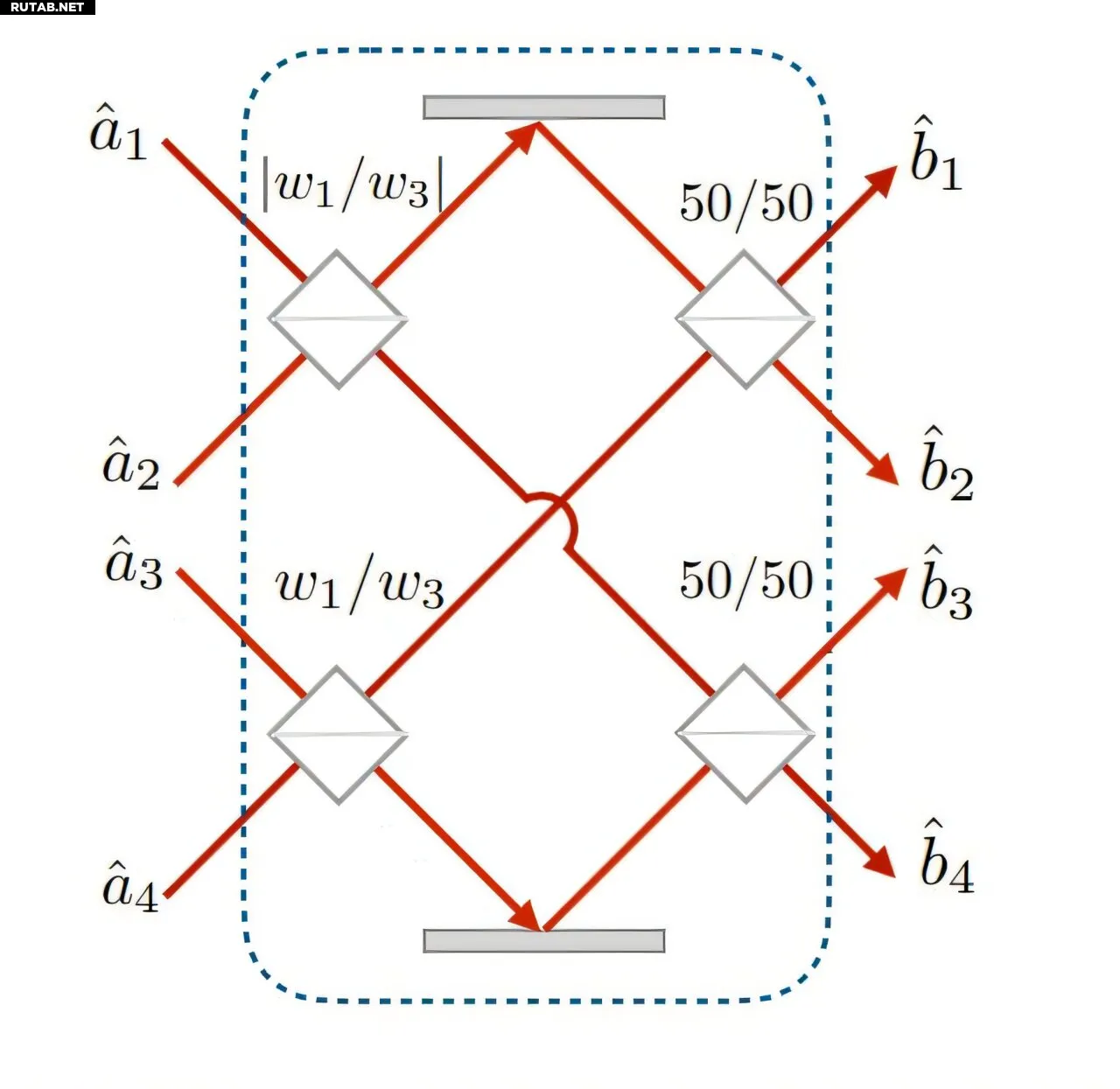 Четырехмодовая линейная сеть U для генерации полезных запутанных состояний для непрерывно-переменной распределенной квантовой метрологии. Указано соотношение пропускания к отражению для каждого светоделителя. Автор: Вэньчао Ге и др.