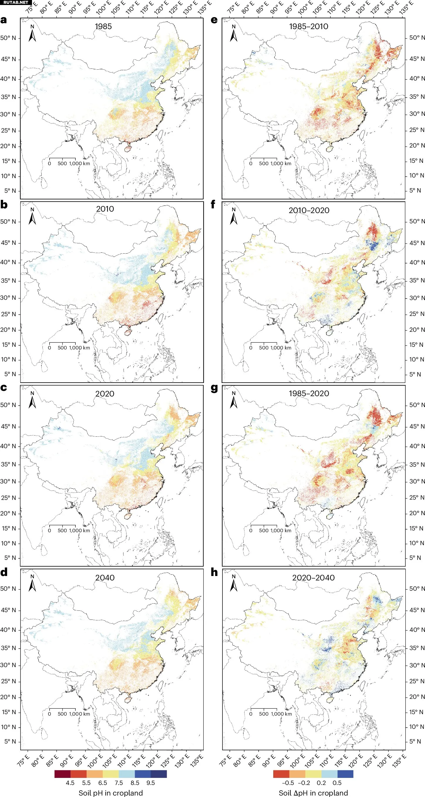 Используя эти данные, исследователи разработали сложную модель машинного обучения для выявления пространственно-временных изменений pH верхнего слоя почвы по всему Китаю с 1985 по 2040 год. Их анализ выявил совокупное снижение примерно на 0,25 единицы pH в период с 1985 года до точки стабилизации в 2013 году.