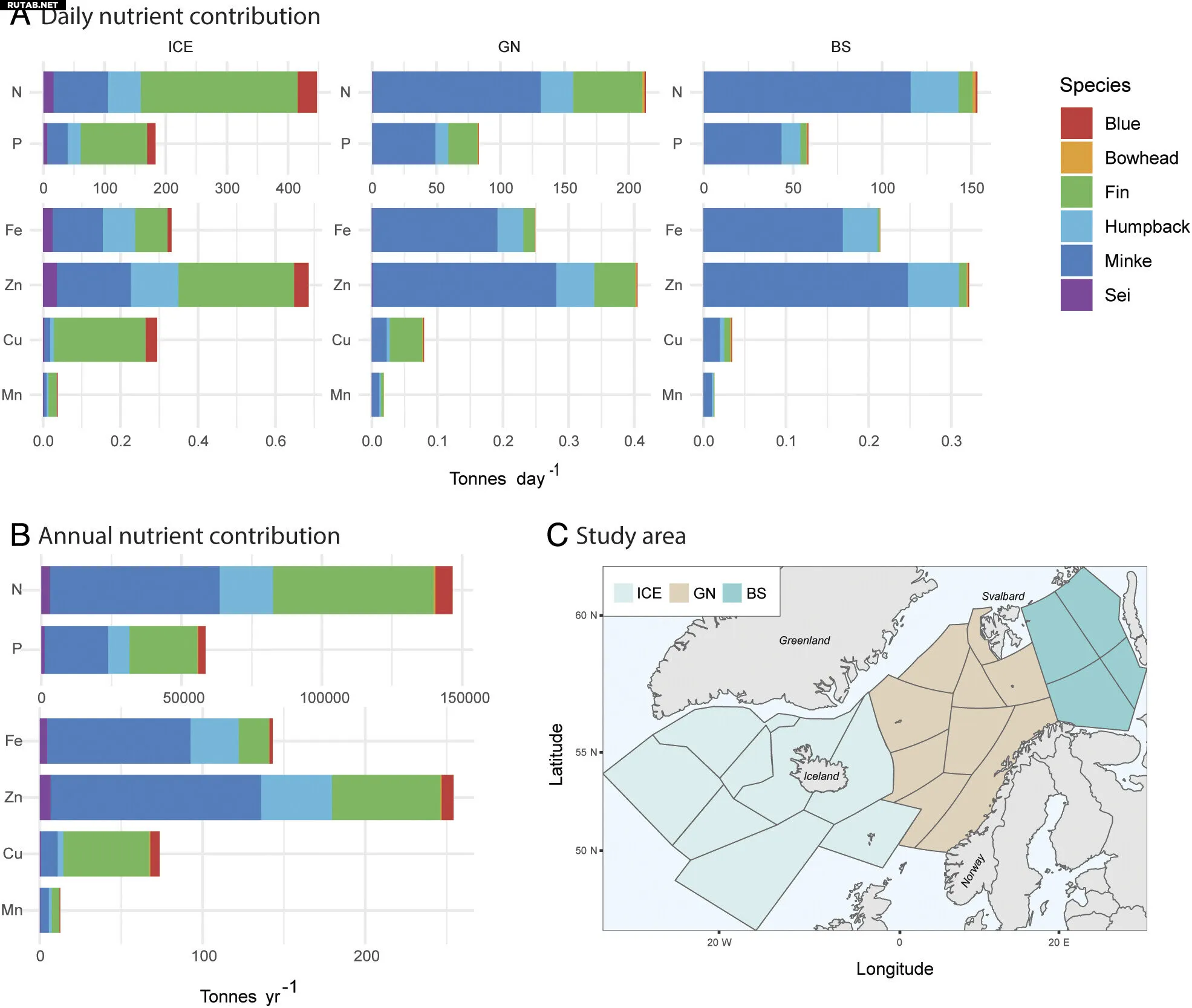 Результаты показали, что усатые киты ежедневно выделяют в северных морях более 815 тонн азота (в основном с мочой) и 325 тонн фосфора (с фекалиями).
