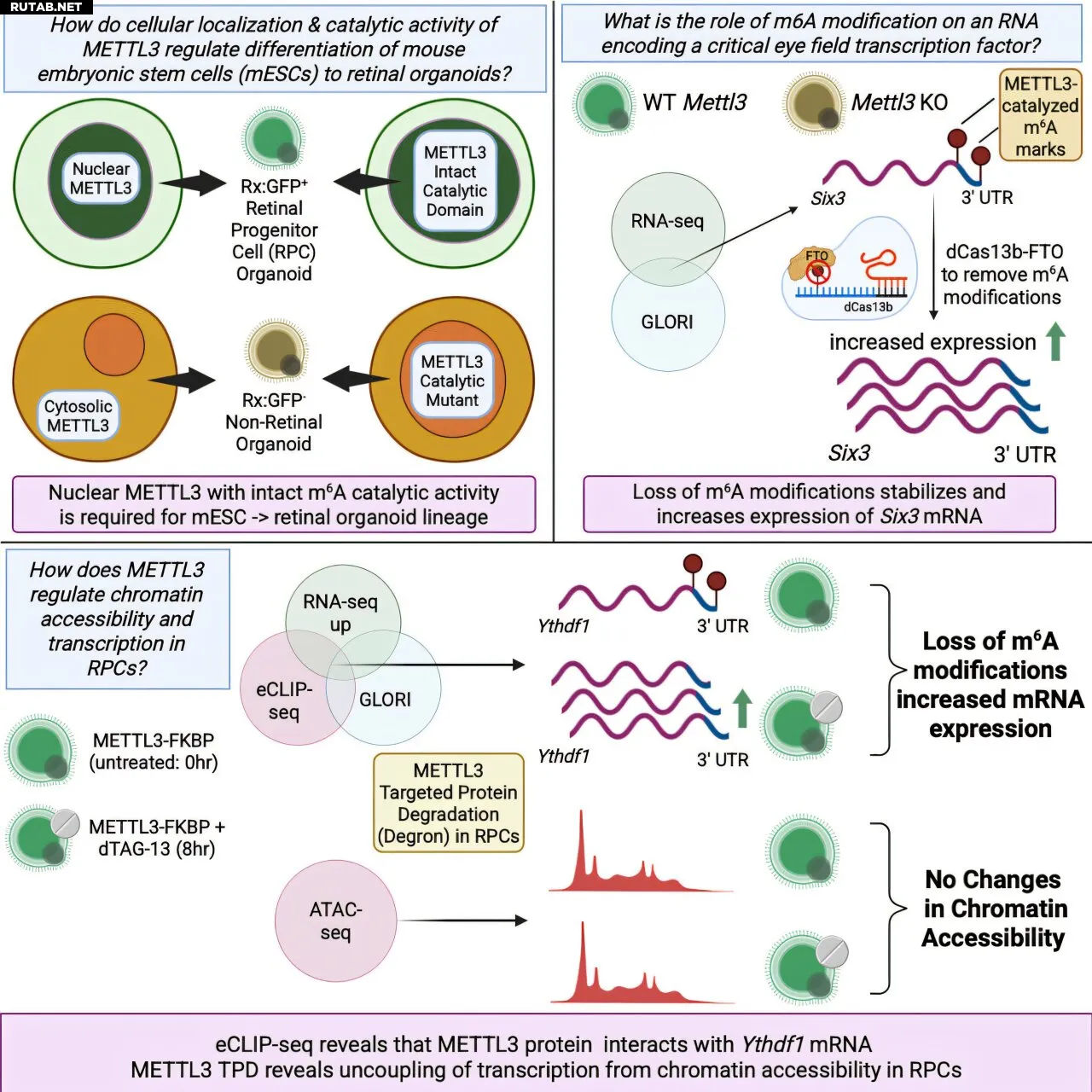 В исследовании ученые сосредоточились на белке METTL3, который добавляет метильные группы к РНК. Используя генетические инструменты, они изучили последствия удаления METTL3 или его модификации, чтобы он не мог добавлять метильные группы. Они обнаружили, что METTL3 должен находиться в ядре, чтобы управлять формированием клеток сетчатки.