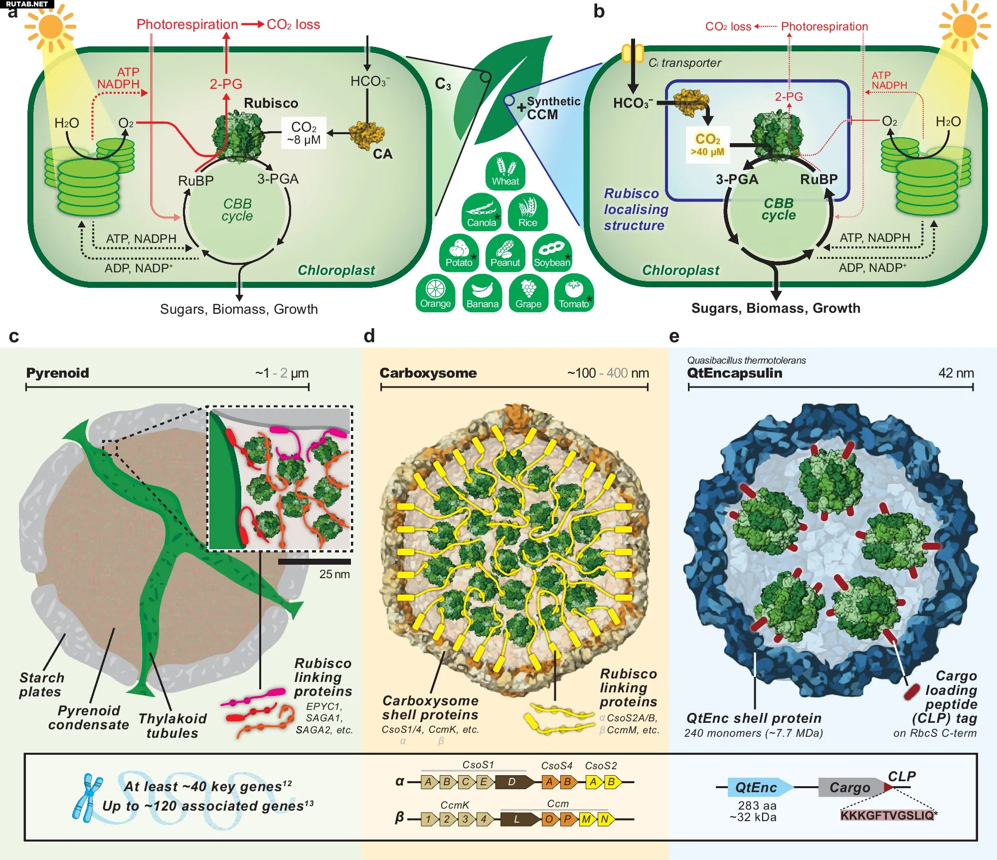 Преимущества и примеры интеграции естественных и искусственных CCM-компартментов, содержащих Rubisco, в хлоропласты растений. Автор: Nature Communications (2025). DOI: 10.1038/s41467-025-65307-9