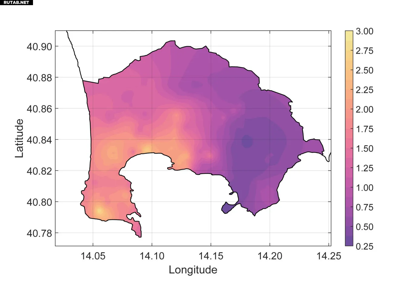 Карта сейсмического усиления красной зоны Кампи-Флегрей. Значения выше единицы означают усиление сейсмических волн, ниже единицы — ослабление. Автор: CC BY-NC-ND 4.0, Finazzi et al. (2025)
