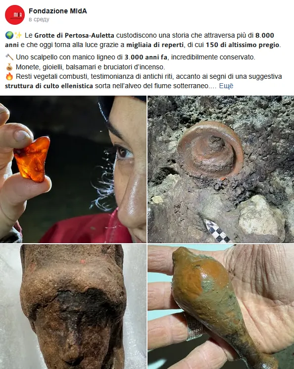 Археологи обнаружили культовое сооружение эллинистической эпохи и дополнительные части свайного поселения бронзового века в пещерах Пертоза-Аулетта на юге Италии. Расположенная в провинции Салерно, эта карстовая пещерная система, также известная как Гротте-дель-Анджело, имеет протяженность около 2500 метров и включает единственную в Италии судоходную подземную реку. Заселение пещер людьми началось около 8000 лет назад, и это место является одним из самых значительных археологических объектов региона.