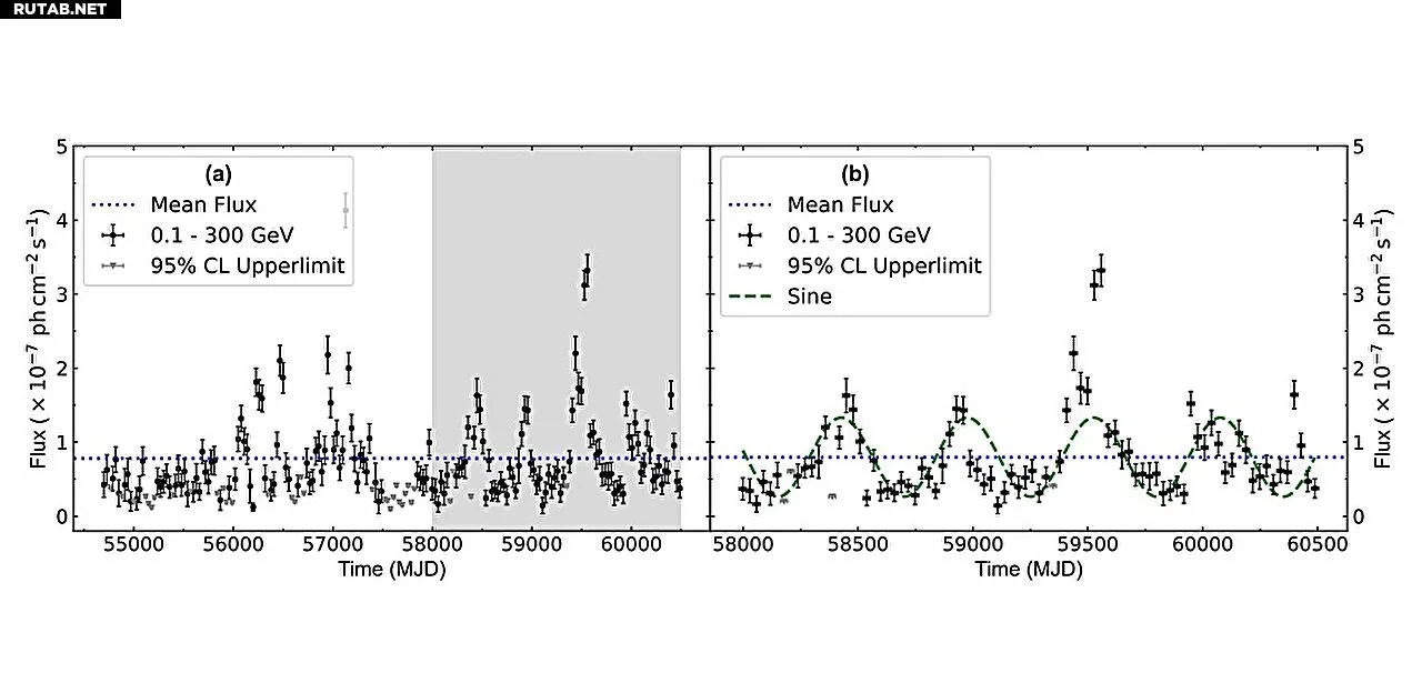 Кривая блеска 4FGL J0309.9-6056, полученная Fermi-LAT за ~16 лет (MJD 54683−60503). Серые перевернутые треугольники представляют верхние пределы на уровне значимости 95%. Панель (b): Увеличен затененный участок (MJD 57983−60503) с левой панели. Синяя пунктирная линия представляет средний поток, а зеленая сплошная линия показывает синусоидальную функцию со средним периодом примерно 550 дней, полученную методами LSP, REDFIT и WWZ. Автор: arXiv (2025). DOI: 10.48550/arxiv.2510.21205