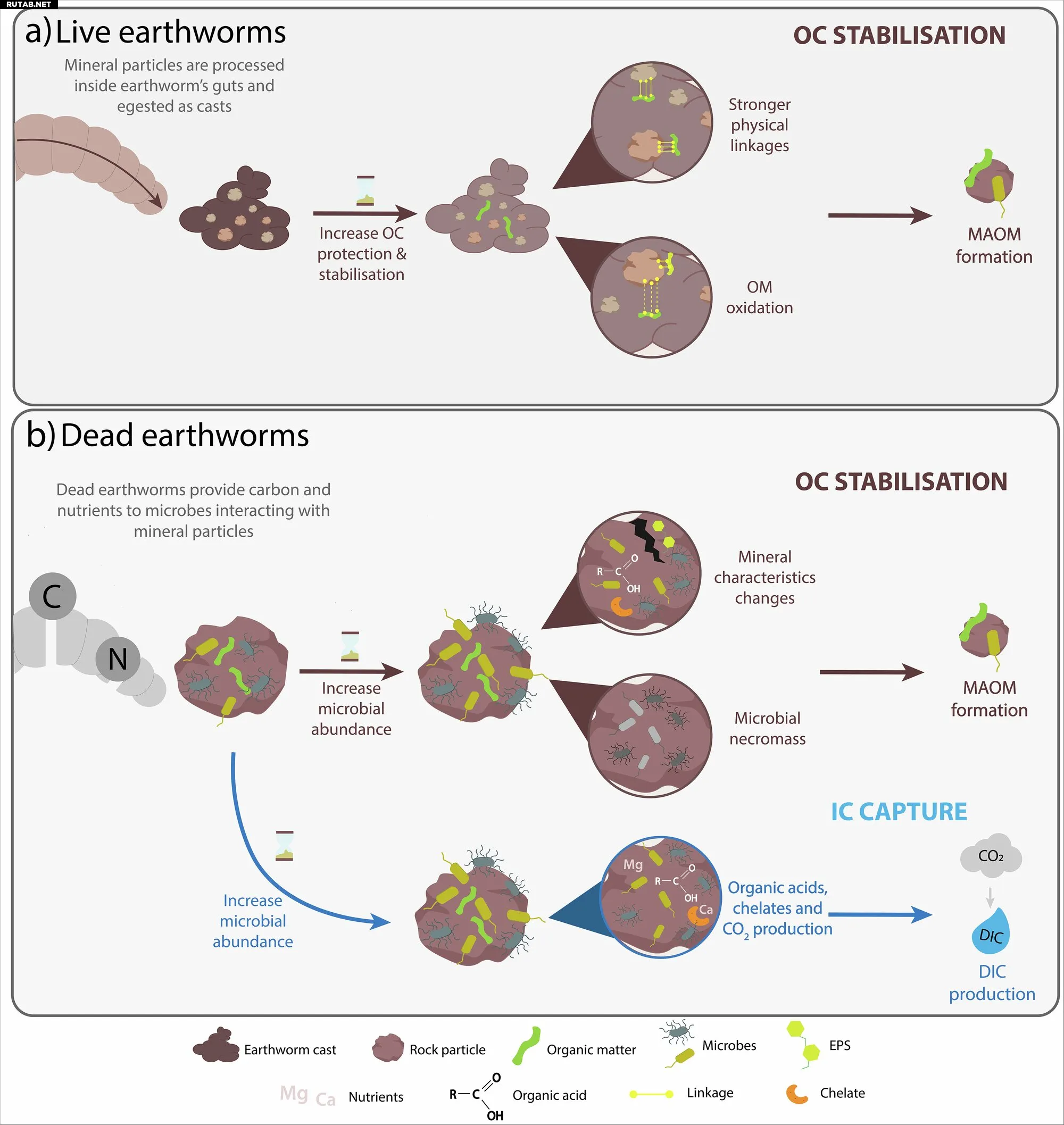 Учёные из Вагенингенского университета исследовали роль как живых, так и мёртвых дождевых червей в процессе улавливания углерода через усиленное выветривание минералов. В лабораторном эксперименте они отслеживали различные пути углерода в течение четырёх месяцев.