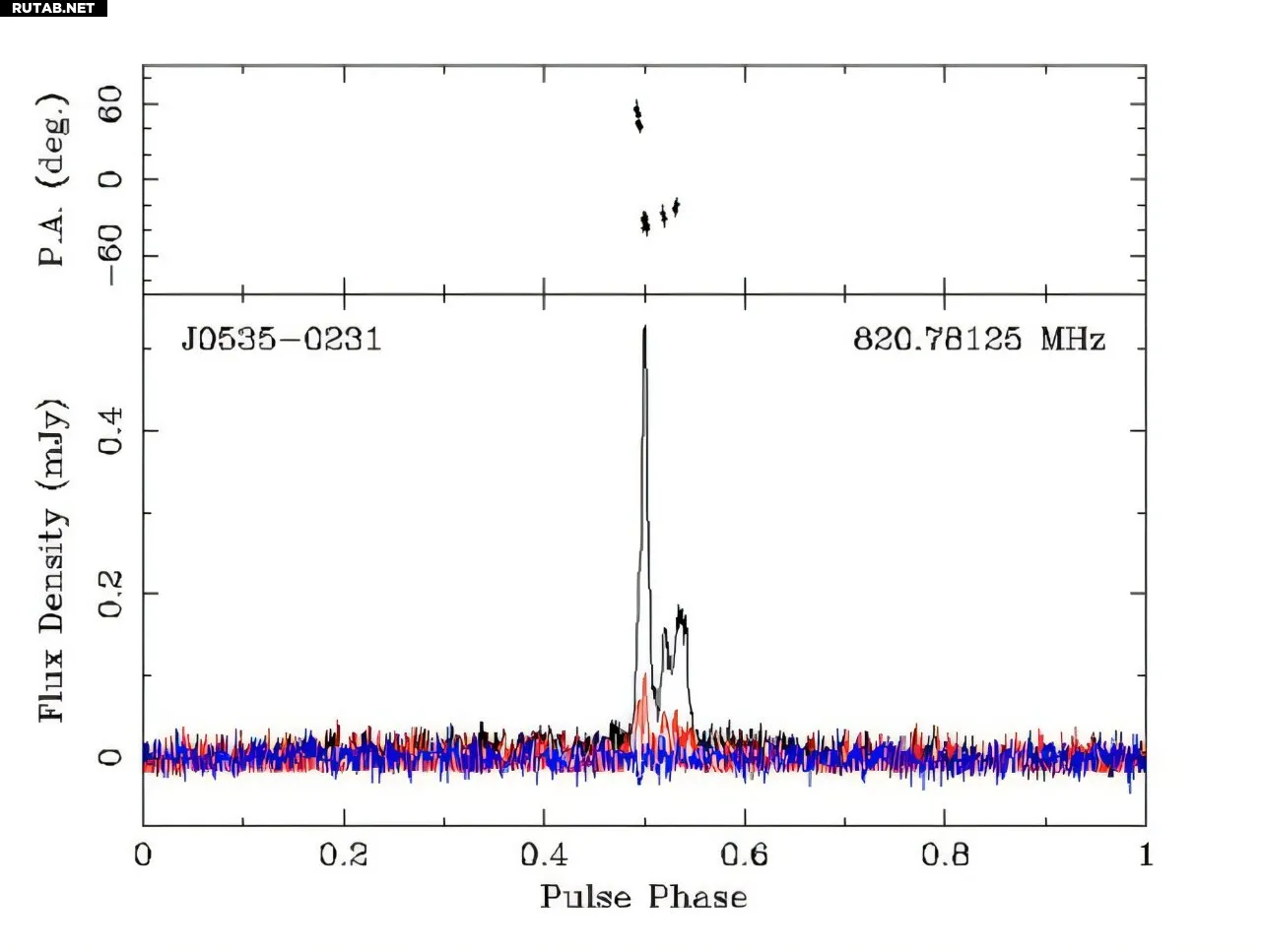 Калиброванный по потоку и поляризации составной профиль пульсара PSR J0535–0231 на частоте 820 МГц, полученный на телескопе GBT за 2.97 часа наблюдений. Автор: arXiv (2025). DOI: 10.48550/arxiv.2510.22910