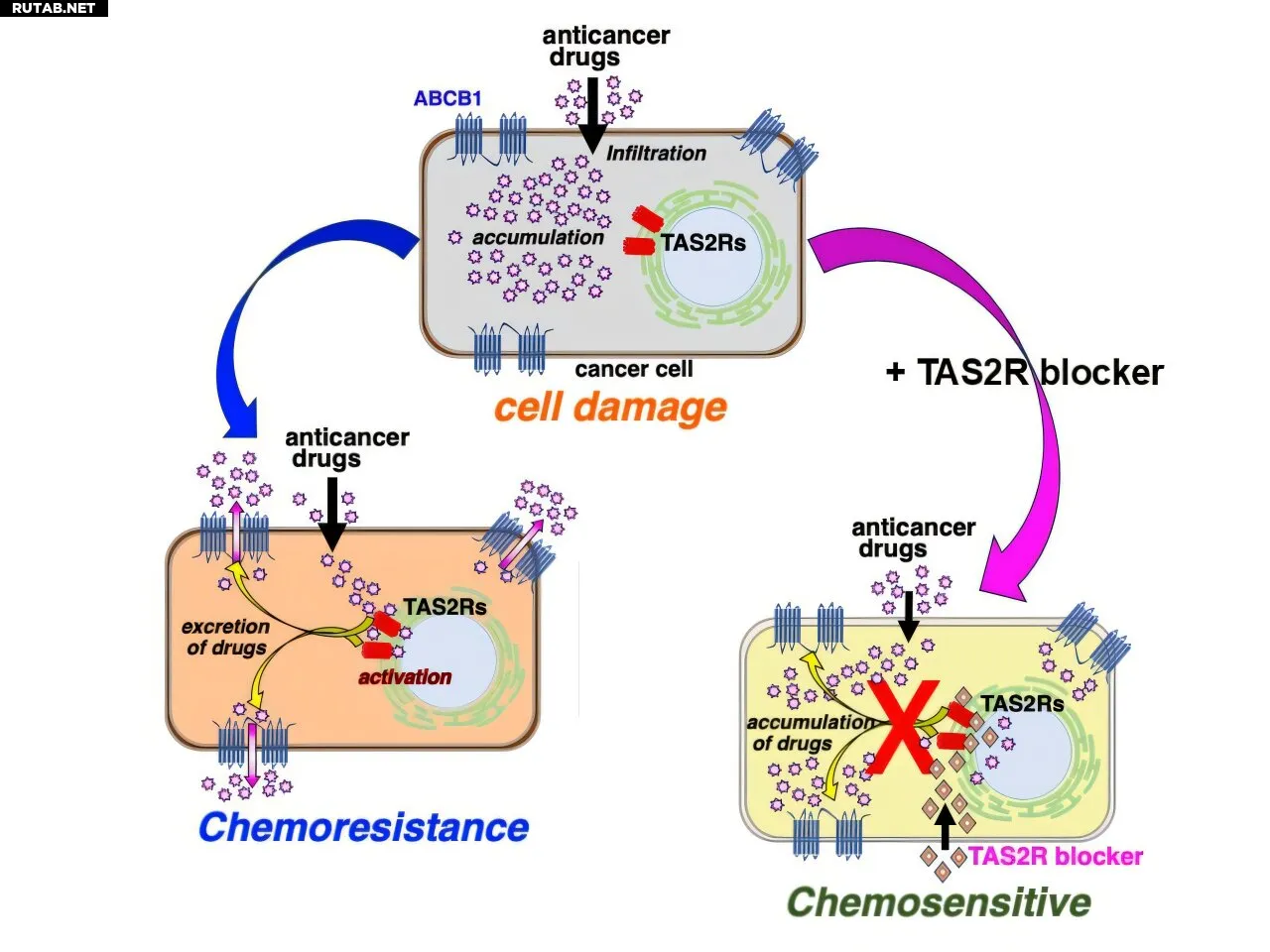 Внутри раковых клеток находятся различные рецепторы горького вкуса, способные распознавать множество противораковых препаратов. Как только препарат проникает в клетку, эти рецепторы активируются, запуская насосы выведения, которые транспортируют препарат из клетки.