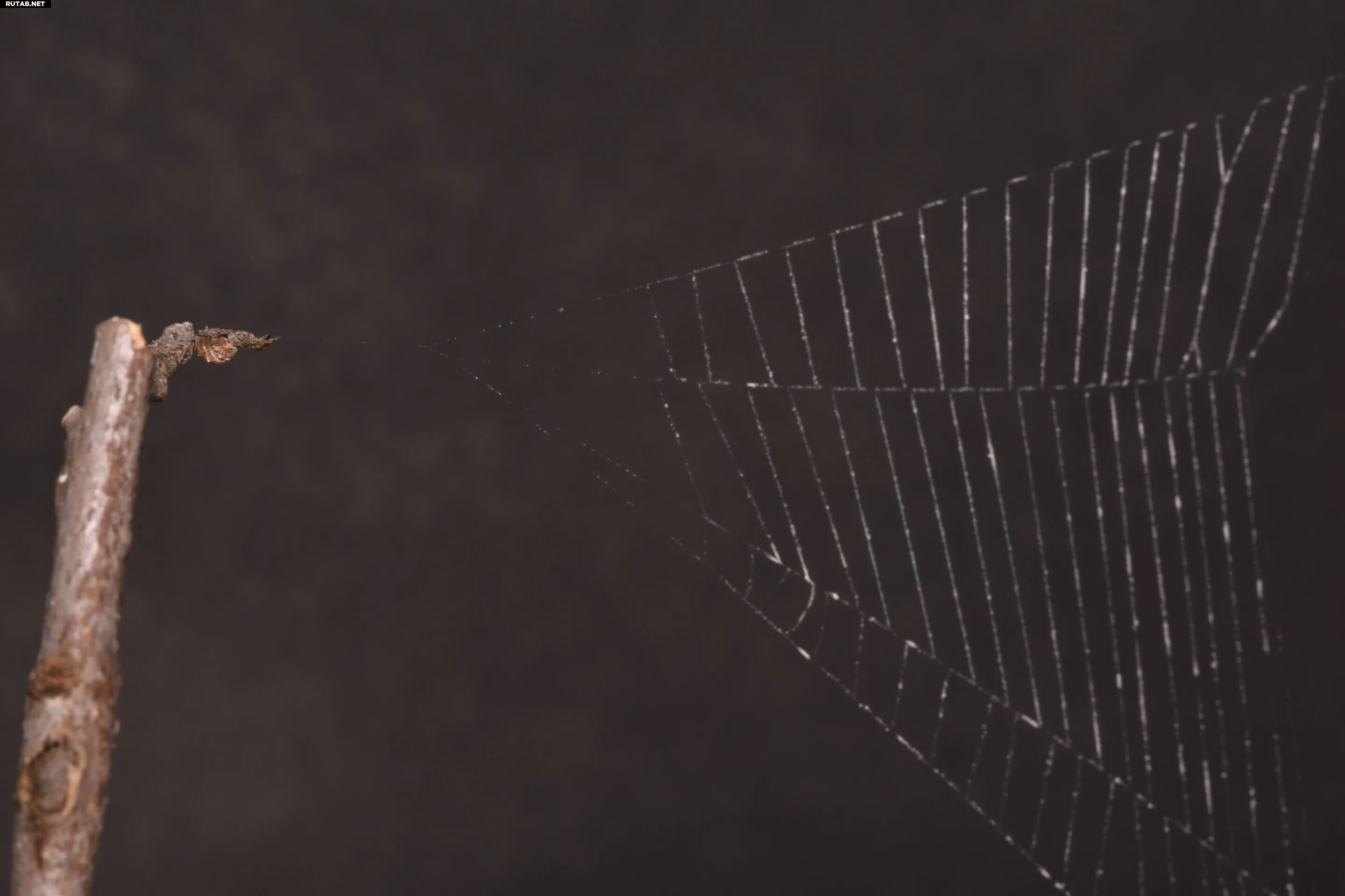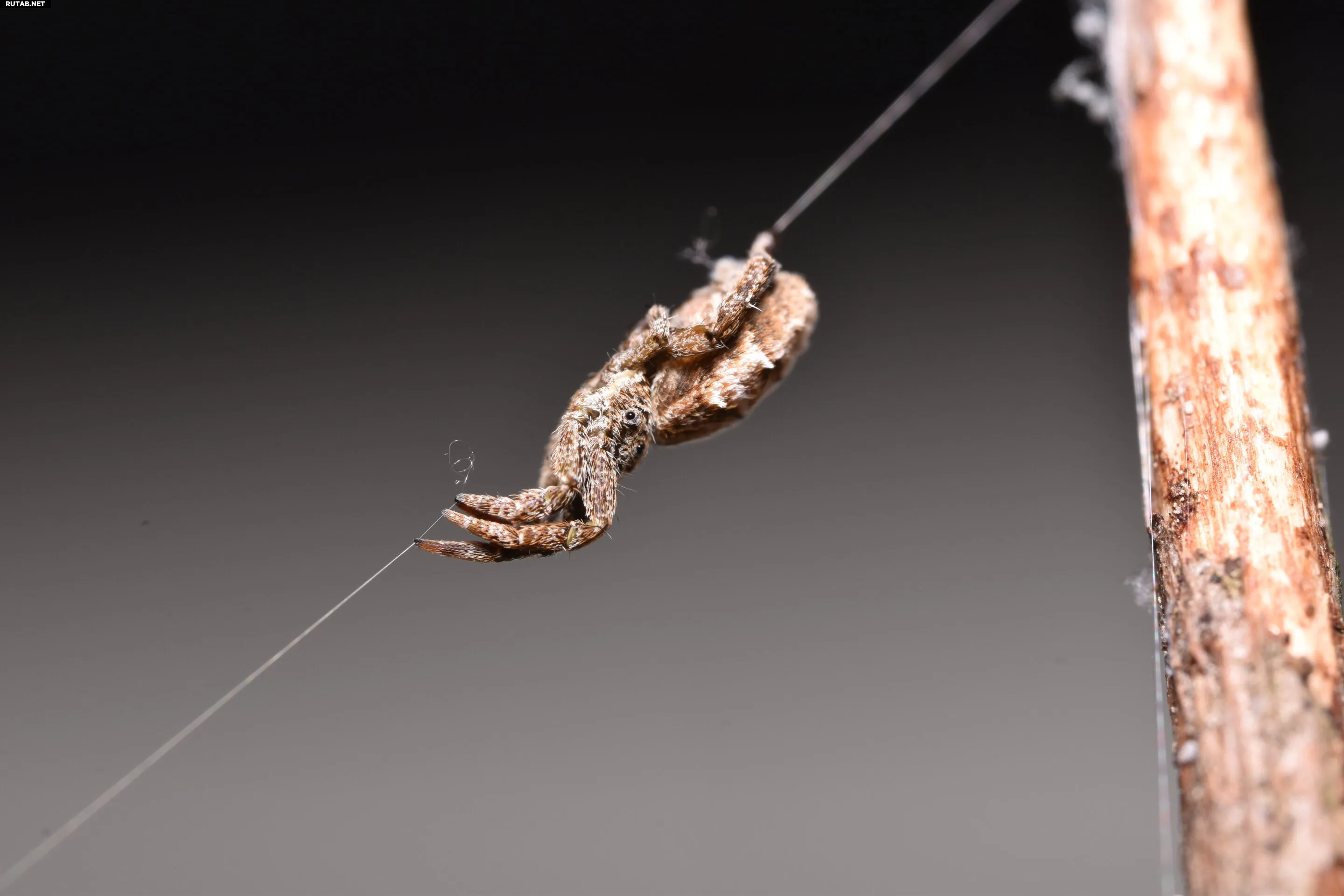 Крупный план паука Hyptiotes cavatus, удерживающего опорную нить треугольной паутины передними лапами, в то время как задние лапы фиксируют якорную линию. Когда задние лапы отпускают якорную линию, паук и паутина устремляются вперёд, опутывая добычу. Автор: Джессика Гарб