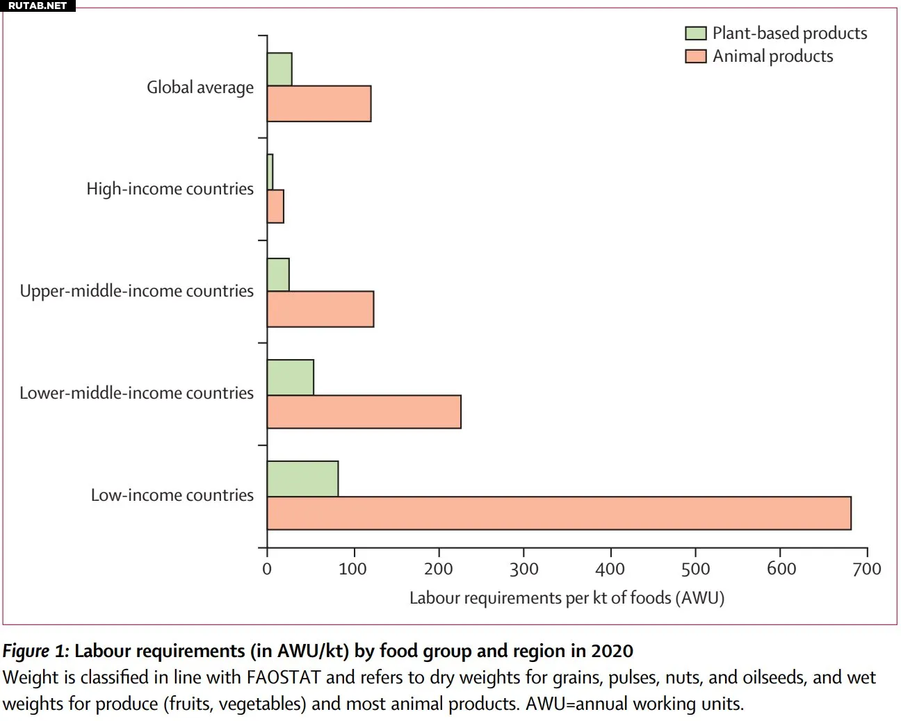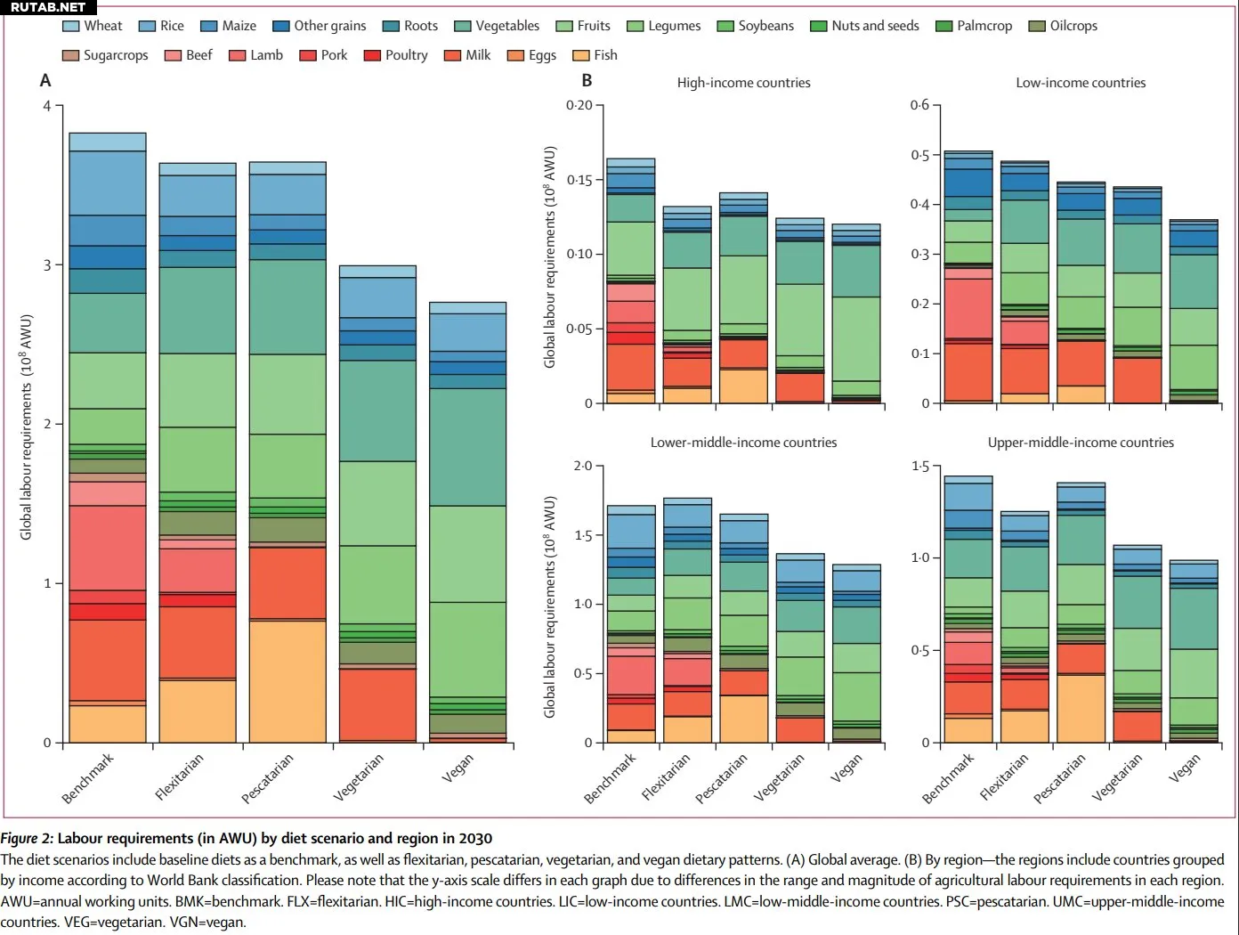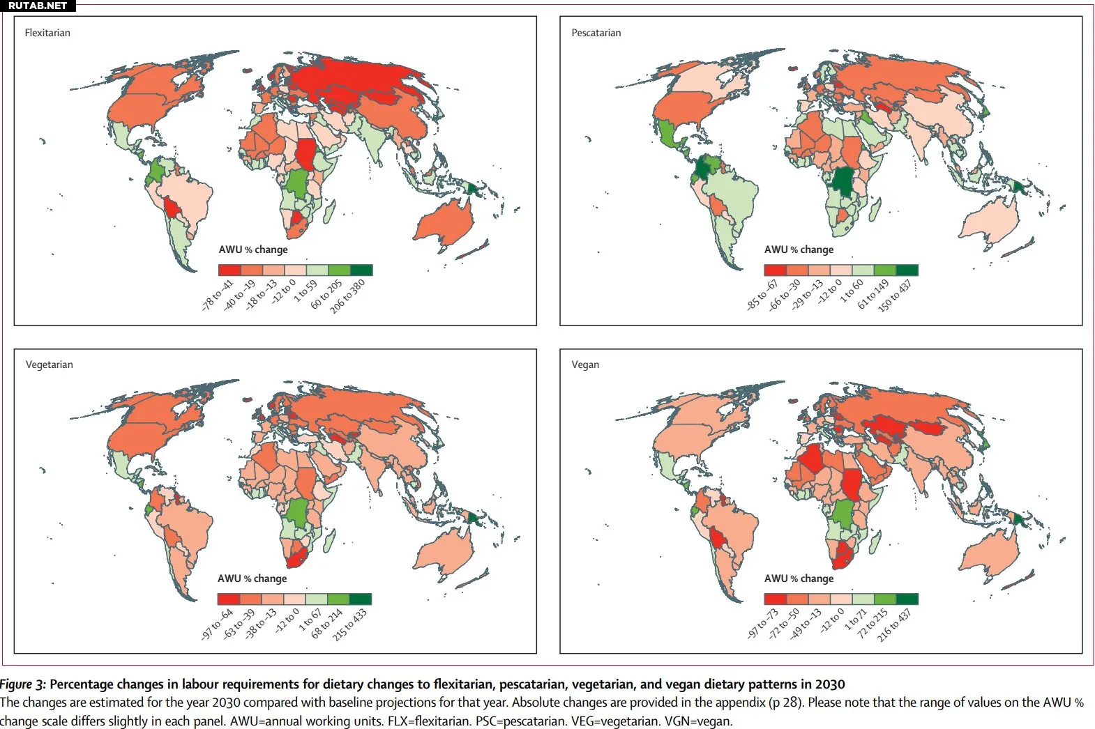 Согласно исследованию, опубликованному в The Lancet Planetary Health, более широкое распространение растительных диет может сократить глобальные потребности в сельскохозяйственной рабочей силе на 5–28% к 2030 году. Это эквивалентно потере 18–106 миллионов рабочих мест с полной занятостью, в основном из-за снижения спроса на животноводческую продукцию.