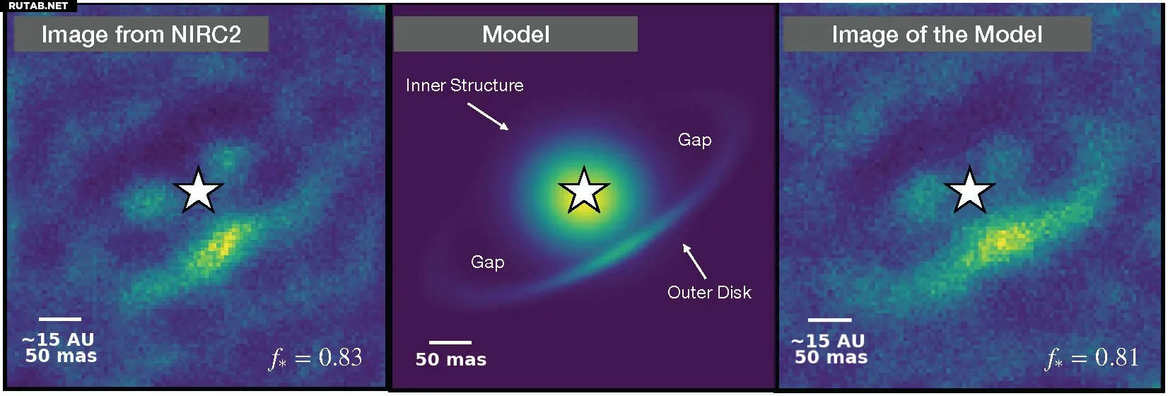 Изображение пыли вокруг молодой звезды HD34282, полученное с помощью алгоритма обработки данных интерферометрии. Свет от звезды удалён, её местоположение отмечено символом звезды. Модель (в центре) включает кольцеобразную внутреннюю структуру вокруг звезды — возможно, пылевую оболочку. Вокруг звезды и внутренней структуры находится большой протопланетный диск. Между ними — щель размером ~40 а.е., где могут формироваться планеты. Справа — изображение модели, обработанное тем же алгоритмом, для проверки соответствия данным. Автор: Кристина Видес / Университет Калифорнии в Ирвайне / Обсерватория Кека.