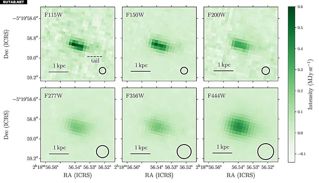 Снимки галактики SXDF-NB1006-2, полученные камерой NIRCam. Автор: arXiv (2025). DOI: 10.48550/arxiv.2510.25721