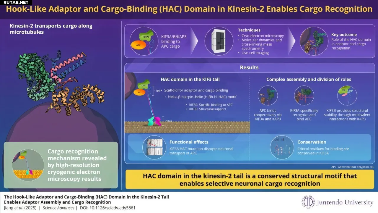 Исследование под руководством профессора Нобутаки Хирокавы из Университета Дзюнтендо было опубликовано в журнале Science Advances 24 октября 2025 года. Используя крио-электронную микроскопию и молекулярное моделирование, ученые реконструировали структуру гетеротримерного комплекса кинезина-2, связанного с белком-грузом APC.