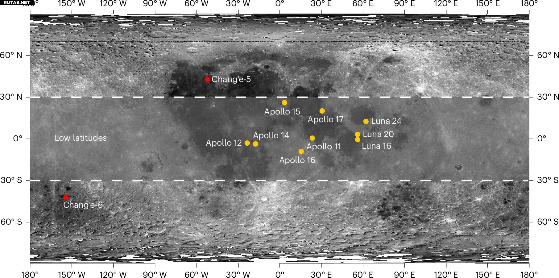Распределение мест отбора проб на Луне. Автор: Nature Geoscience (2025). DOI: 10.1038/s41561-025-01819-9
