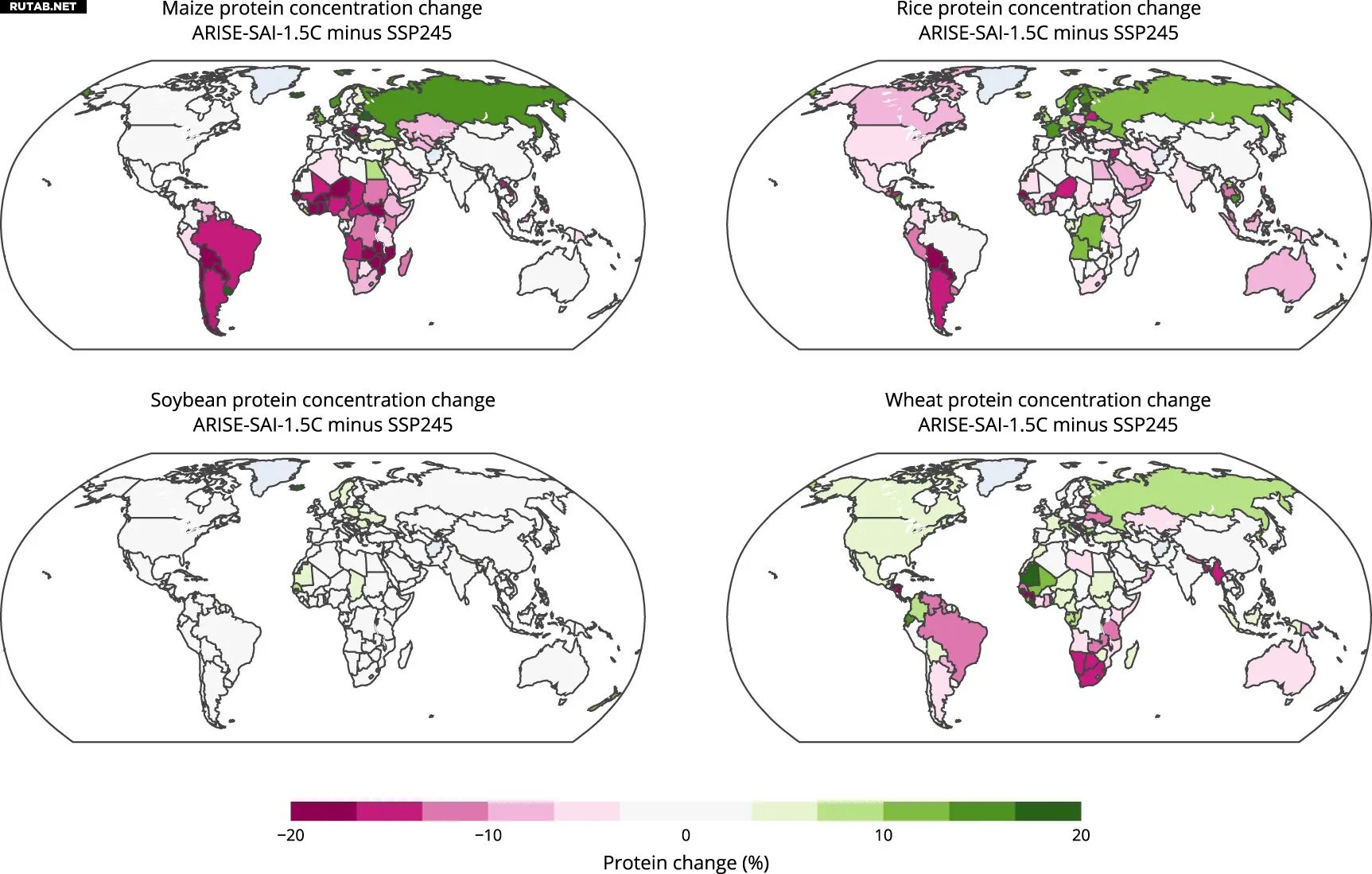 Модели показывают, что SI по-разному повлияет на содержание белка в культурах в разных регионах, причем наибольшее снижение ожидается в странах, которые уже страдают от недоедания и дефицита белка. Авторы подчеркивают, что для принятия более обоснованных решений относительно SAI необходимы дополнительные полевые исследования и разработка моделей.