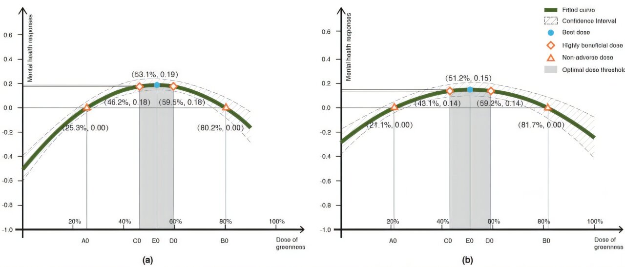 Ученые проанализировали данные за 40 лет из 69 исследований с пяти континентов. Анализ выявил четкие оптимальные пороги: для зеленых насаждений на уровне глаз (улицы, парки) максимальная польза достигается при 53,1% озеленения, а для общего зеленого покрова (вид сверху) — при 51,2%.