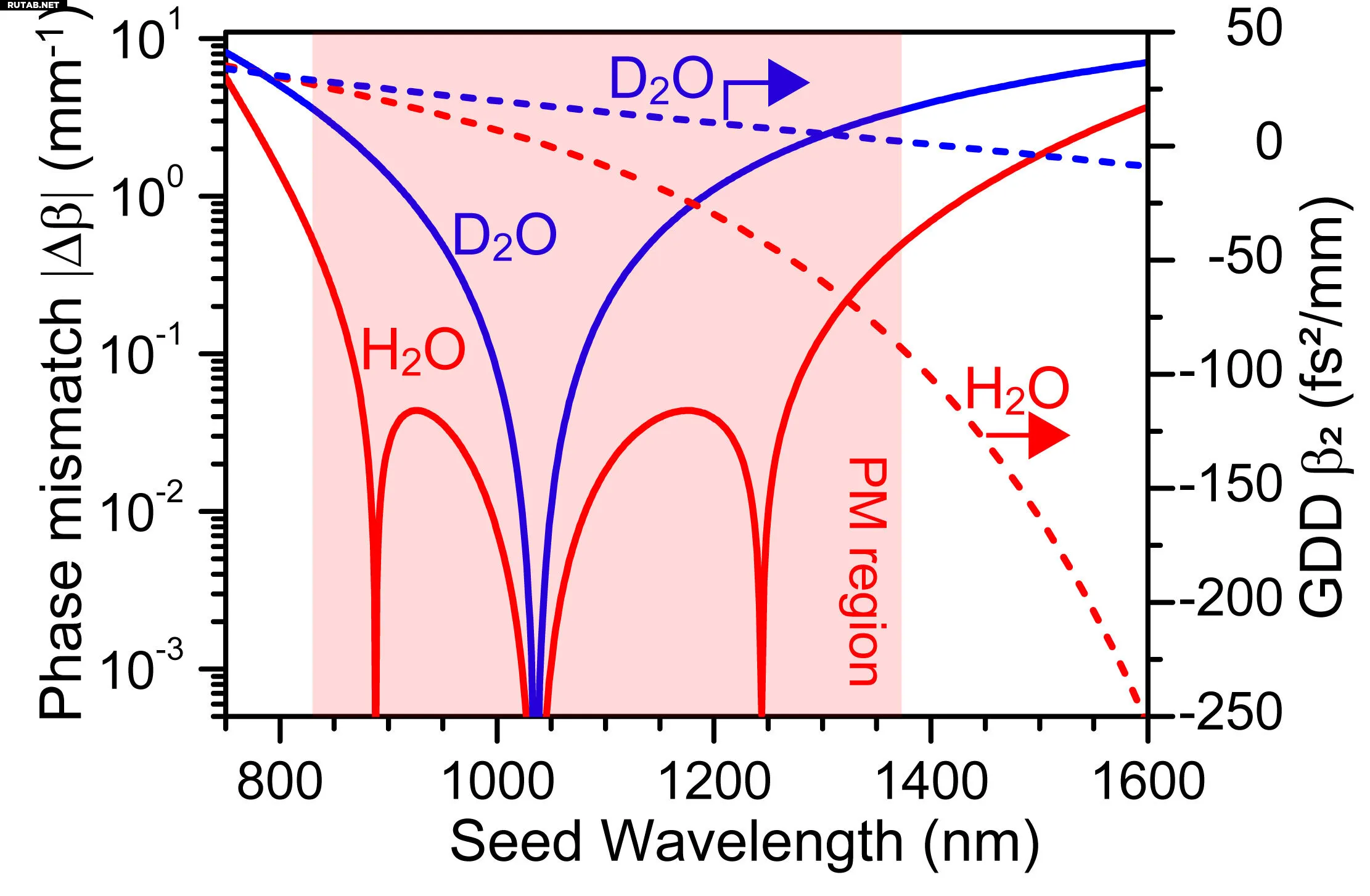 Зависимость дисперсии от длины волны и условия фазового рассогласования для четырехволнового смешения в обычной воде (H₂O) и тяжелой воде (D₂O). Автор: Institute for Molecular Science / Tsuneto Kanai