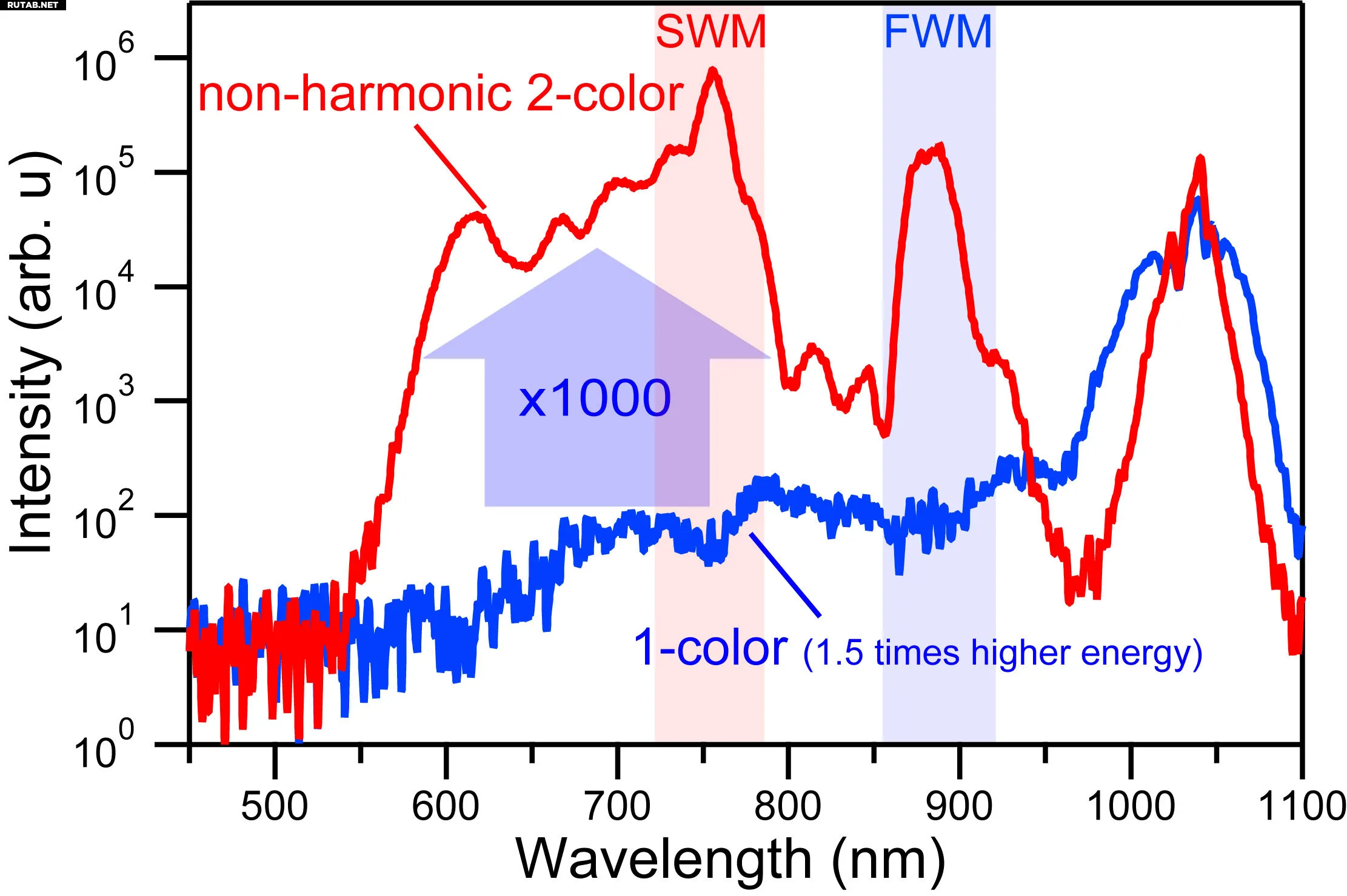 Экспериментальная демонстрация того, как негармоническое двухцветное фемтосекундное возбуждение производит суперконтинуум в ~1000 раз сильнее в воде по сравнению с обычным одноцветным возбуждением. Автор: Institute for Molecular Science / Tsuneto Kanai