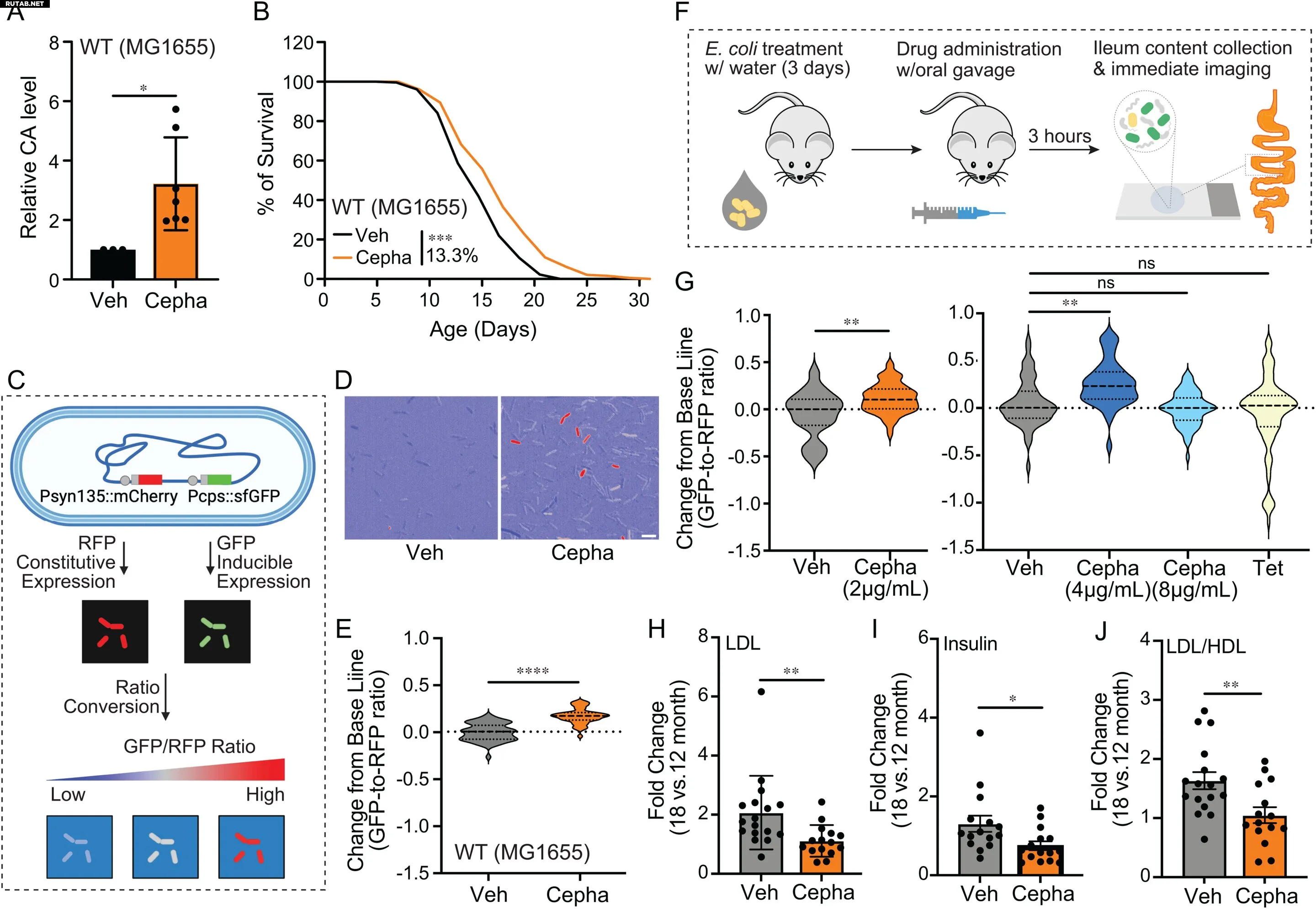 У мышей низкие дозы цефалоридина вызывали транскрипцию в части генома кишечных бактерий, ответственной за синтез колановых кислот. Это привело к изменениям возрастных метаболических сдвигов у животных: увеличению уровня «хорошего» холестерина и снижению «плохого» холестерина у самцов, а также снижению уровня инсулина у самок.