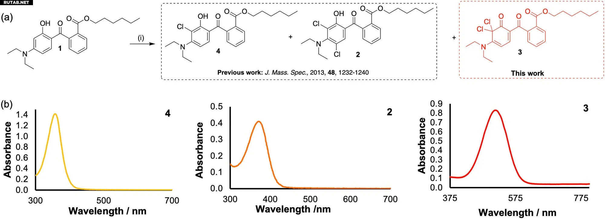 (a) Реакция 1 с NaClO дает 3 (61%) и 4 (37%) (выделенные выходы) (i) NaOCl, CH2Cl2/EtOH (b) УФ-видимые спектры 2, 3 и 4. Автор: Chemical Communications (2025). DOI: 10.1039/d5cc01593f