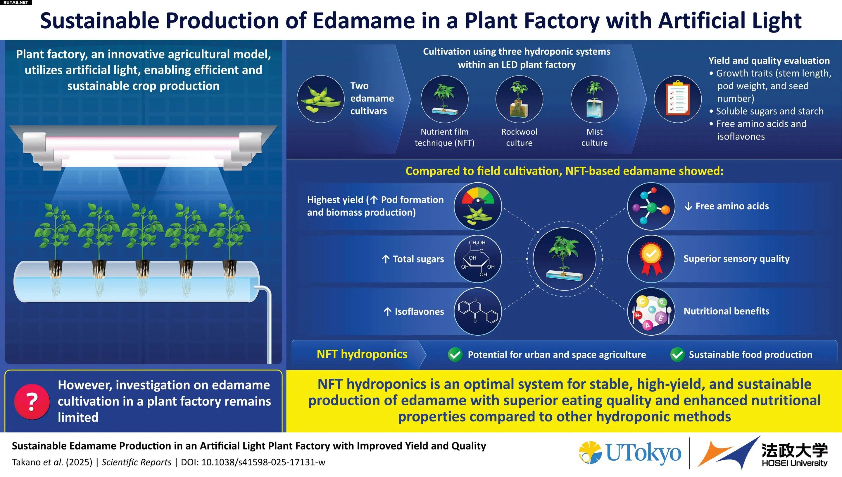 Качественный анализ показал, что эдамаме, выращенный методом NFT, содержит больше сахарозы и изофлавонов — соединений, известных своими полезными для здоровья свойствами. Уровень свободных аминокислот был немного ниже, но в целом NFT получил наивысшую оценку по совокупности факторов.