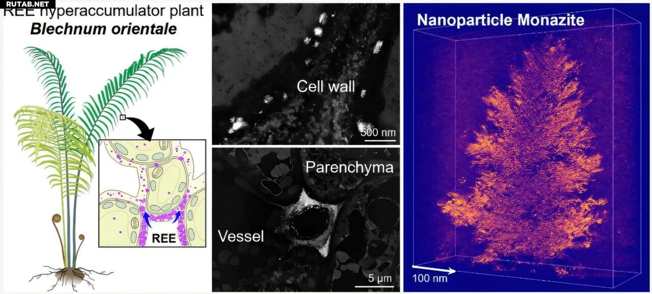 Используя мощные технологии визуализации и химический анализ, команда обнаружила, что папоротник формирует наноразмерные кристаллы богатого РЗЭ минерала монацита в своих тканях, особенно в клеточных стенках и межклеточных пространствах. Монацит является одним из основных источников редкоземельных элементов в геологических месторождениях по всему миру.