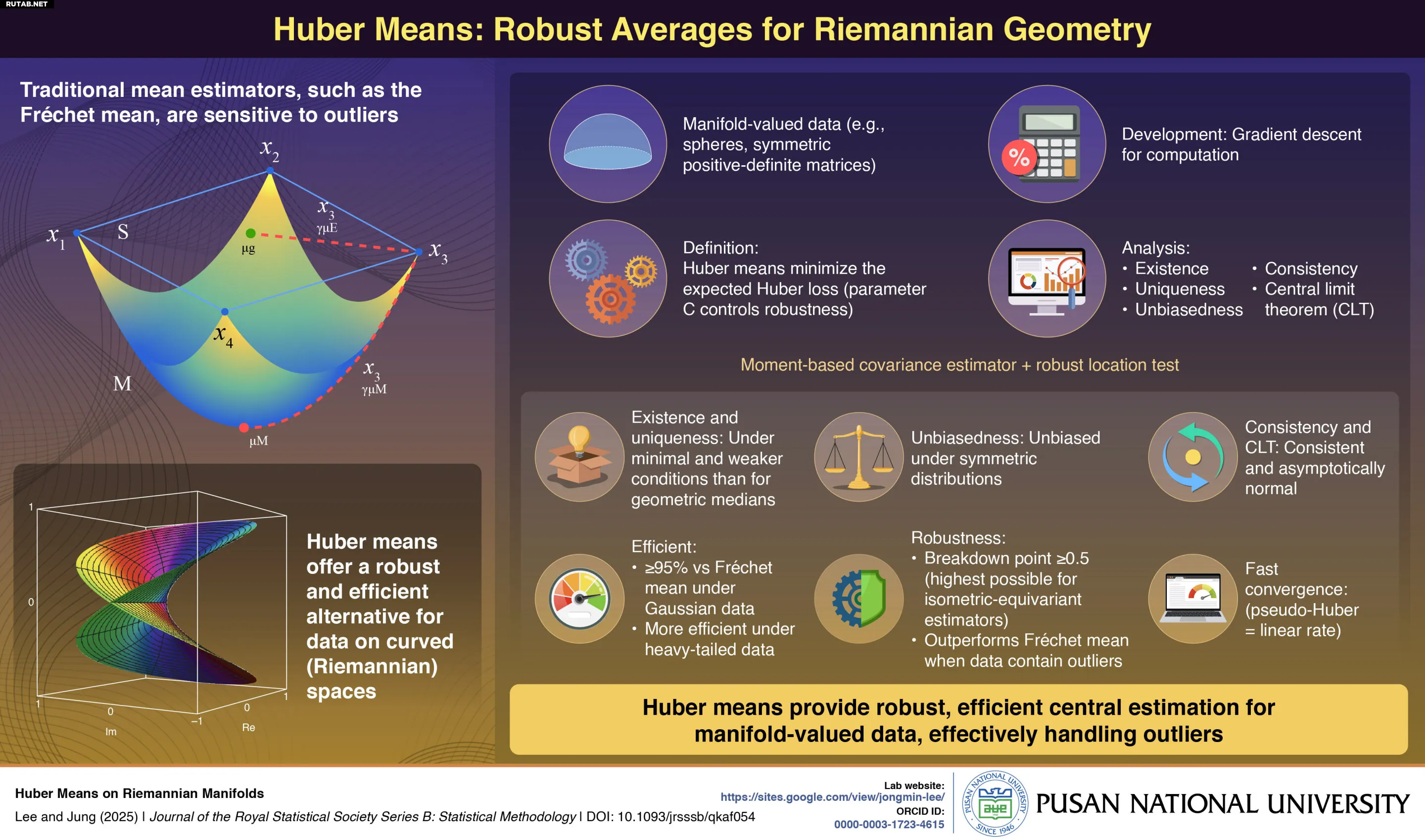 Чтобы решить эту проблему, профессор Чонмин Ли из Национального университета Пусана в сотрудничестве с профессором Сунгкю Чжоном из Сеульского национального университета разработал новый статистический метод, названный средним Хубера, предназначенный для повышения устойчивости и надежности анализа данных на искривленных пространствах. Исследование, опубликованное в «Journal of the Royal Statistical Society Series B: Statistical Methodology» 25 августа 2025 года, представляет собой устойчивое обобщение классического среднего Фреше путем интеграции функции потерь Хубера, объединяя эффективность и устойчивость к выбросам в одной элегантной структуре.