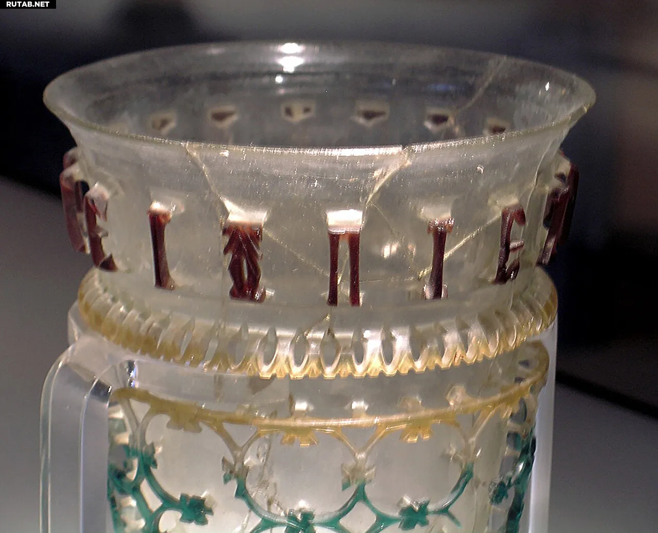 Стеклянный ажурный сосуд 300–350 гг. н.э. с надписью и символом. Надпись: ΠΙΕ ΖΗCΑΙC ΚΑΛWC ΑΕΙ (Пей, живи хорошо всегда!). Автор: Хэлли Мередит