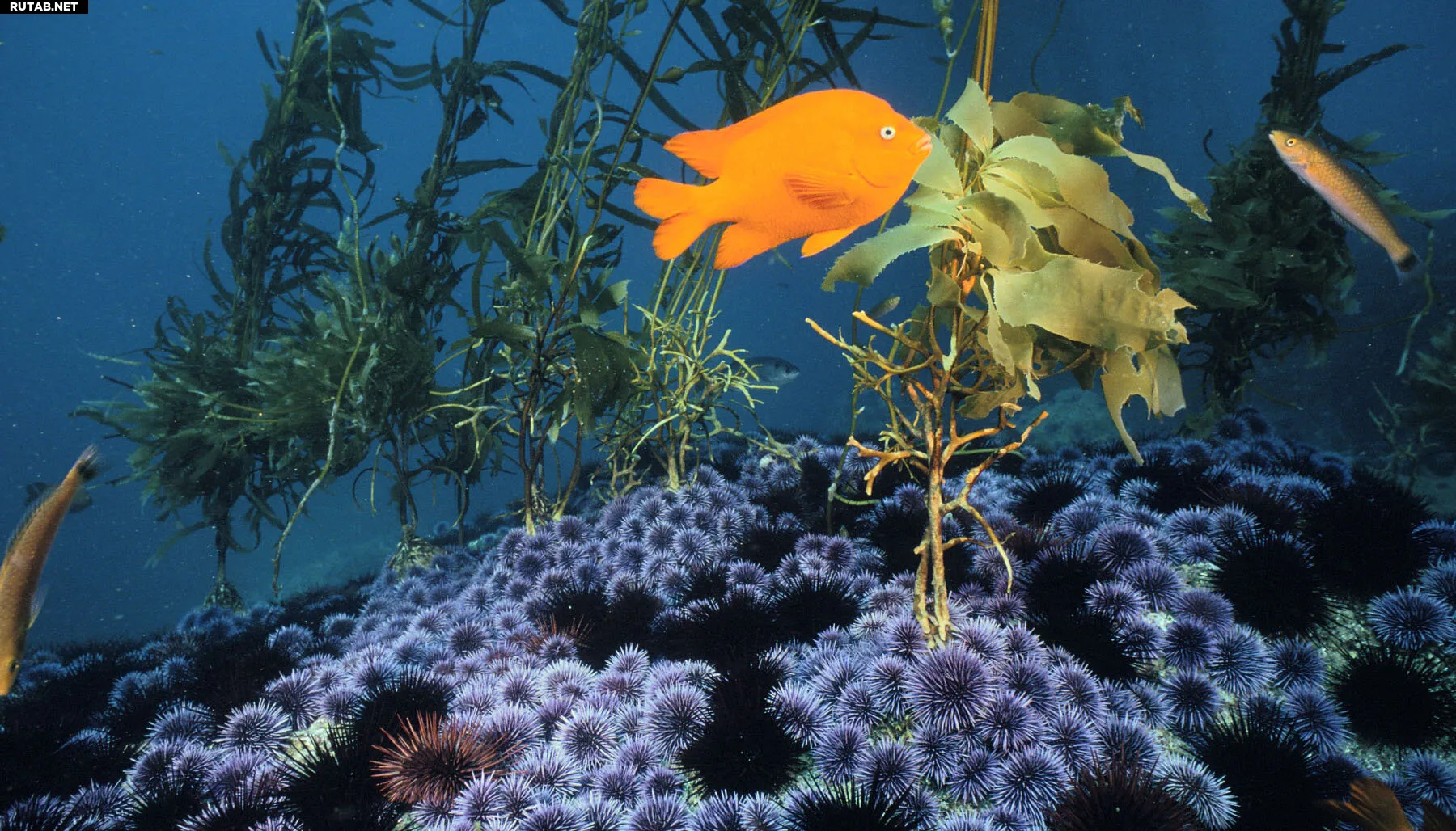 Оранжевый гарибальди проплывает над полем пурпурных морских ежей, которые расплодились вдоль побережья Калифорнии и в годы бума часто уничтожают леса водорослей. Понимание причин циклов бума и спада численности ежей может помочь биологам планировать меры по сохранению сбалансированной прибрежной экосистемы. Автор: Рон МакПик, предоставлено программой долговременных экологических исследований побережья Санта-Барбары