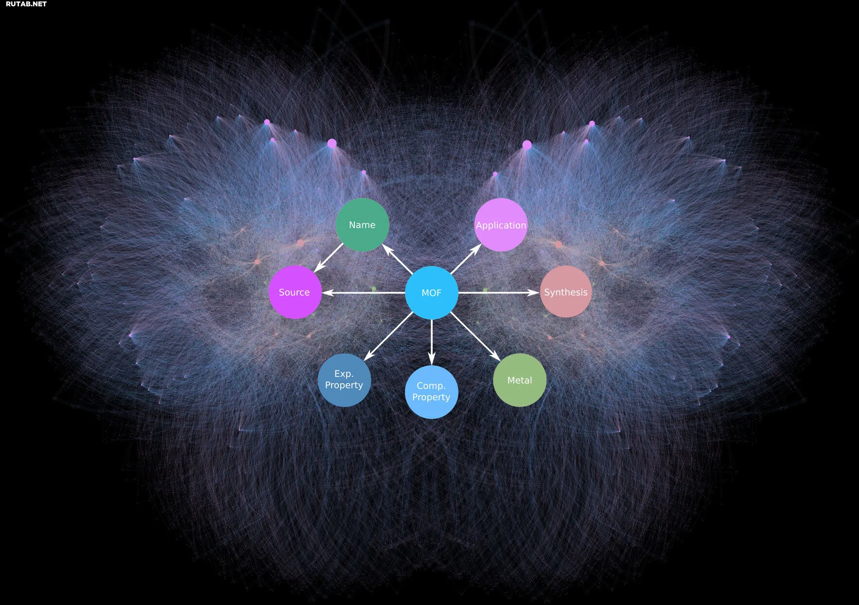 Граф знаний MOF-ChemUnity содержит около 0,5 миллиона точек данных и связей для более чем 15 000 металло-органических каркасов. На переднем плане показаны примеры типов информации, с которой может быть связан каждый материал, включая свойства, применение, методы синтеза и другое. Автор: Томас Пруин