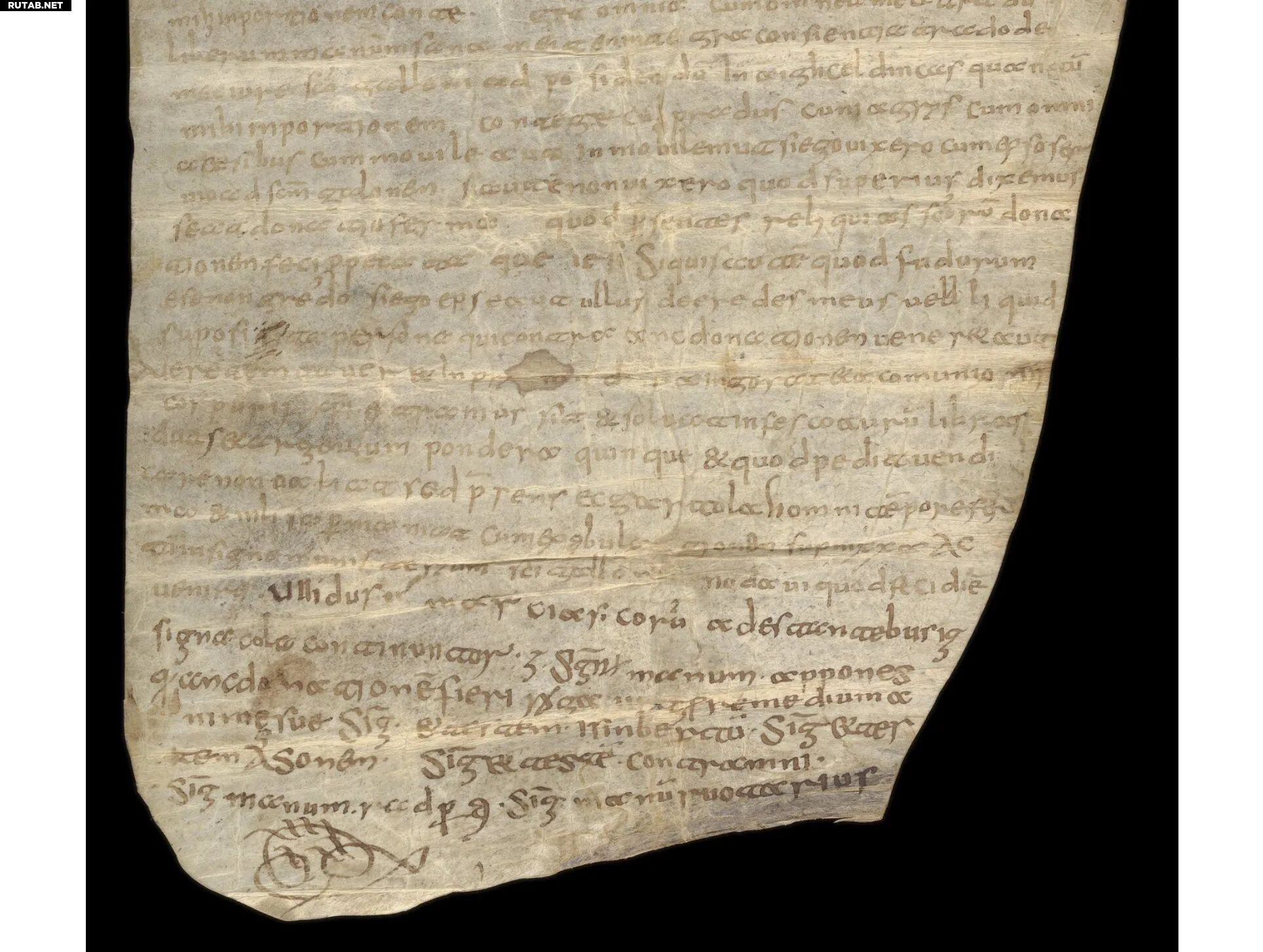 Хартия из архивов аббатства Святого Галла. Датирована 9 марта 736 года. Описывает дарение собственности в Айгельтингене и Нойхаузене около Боденского озения. Архивированные документы подобные этому раскрывают социальные, экономические и сельскохозяйственные практики, преобладавшие в регионе Боденского озера в раннем средневековье. Автор: Санкт-Галлен, Архив аббатства, IV 345 (Частная хартия)