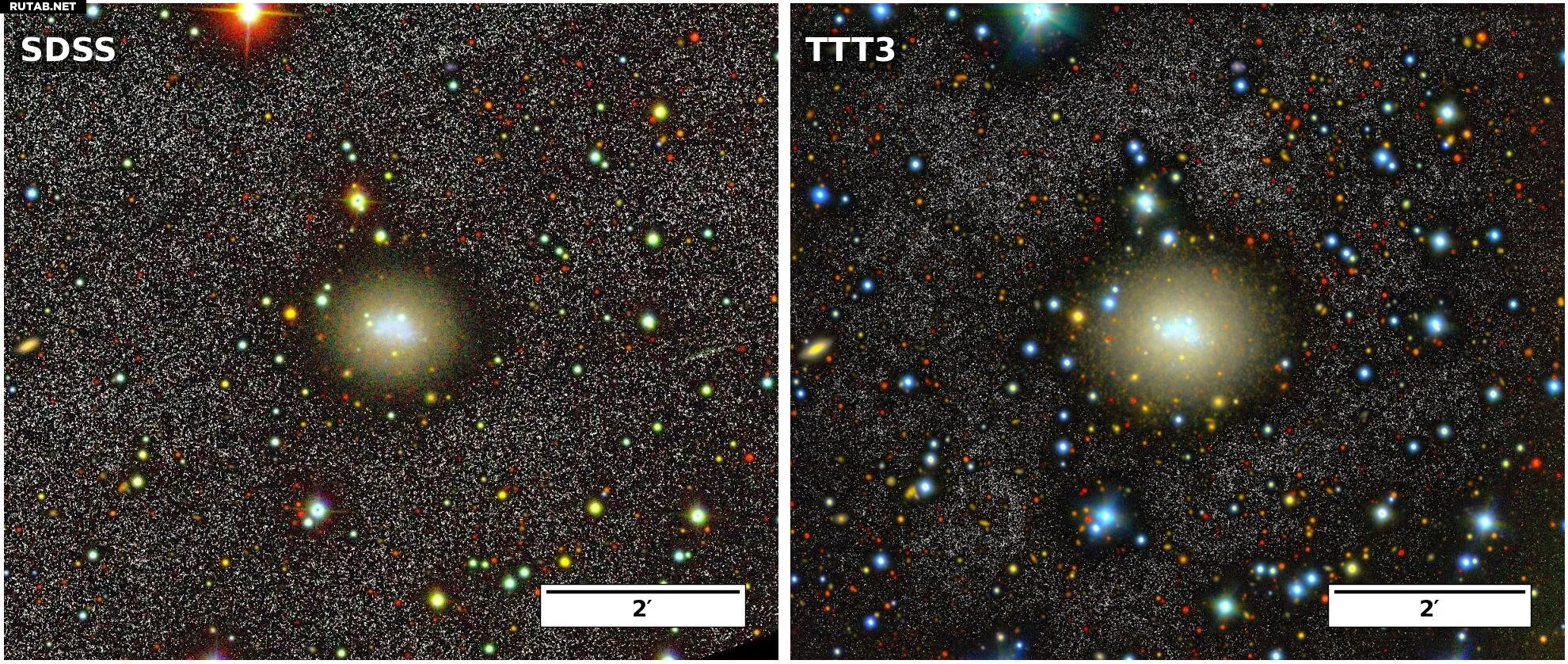 NGC6789, снятая в рамках Слоановского цифрового обзора неба (слева) и глубокое изображение, полученное на телескопе TTT3 (справа). В обоих случаях цветные изображения созданы с использованием комбинации фильтров Sloan g, r и i. На расстоянии галактики 3,6 Мпк одна угловая минута соответствует примерно 1,1 кпк. Чёрно-белый фон изображения соответствует снимку в g-диапазоне, который является нашим самым глубоким набором данных. Автор: arXiv (2025). DOI: 10.48550/arxiv.2511.07041