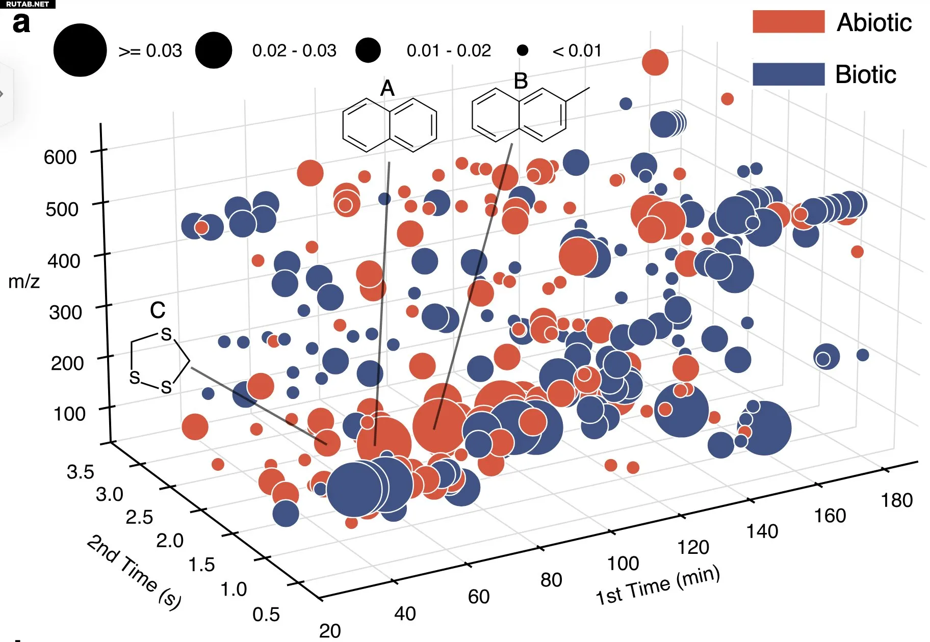 Анализ выявил 9475 пиков в образцах метеоритов и 9070 в земных образцах со статистически значимыми различиями между двумя типами образцов в распределении молекулярных масс и времен удерживания, которые описывают, сколько времени требуется соединению для прохождения через две колонки хроматографа. Органические соединения в метеоритных образцах показали значительно меньшее время удерживания, что согласуется с более высокой летучестью абиотически образованных материалов.