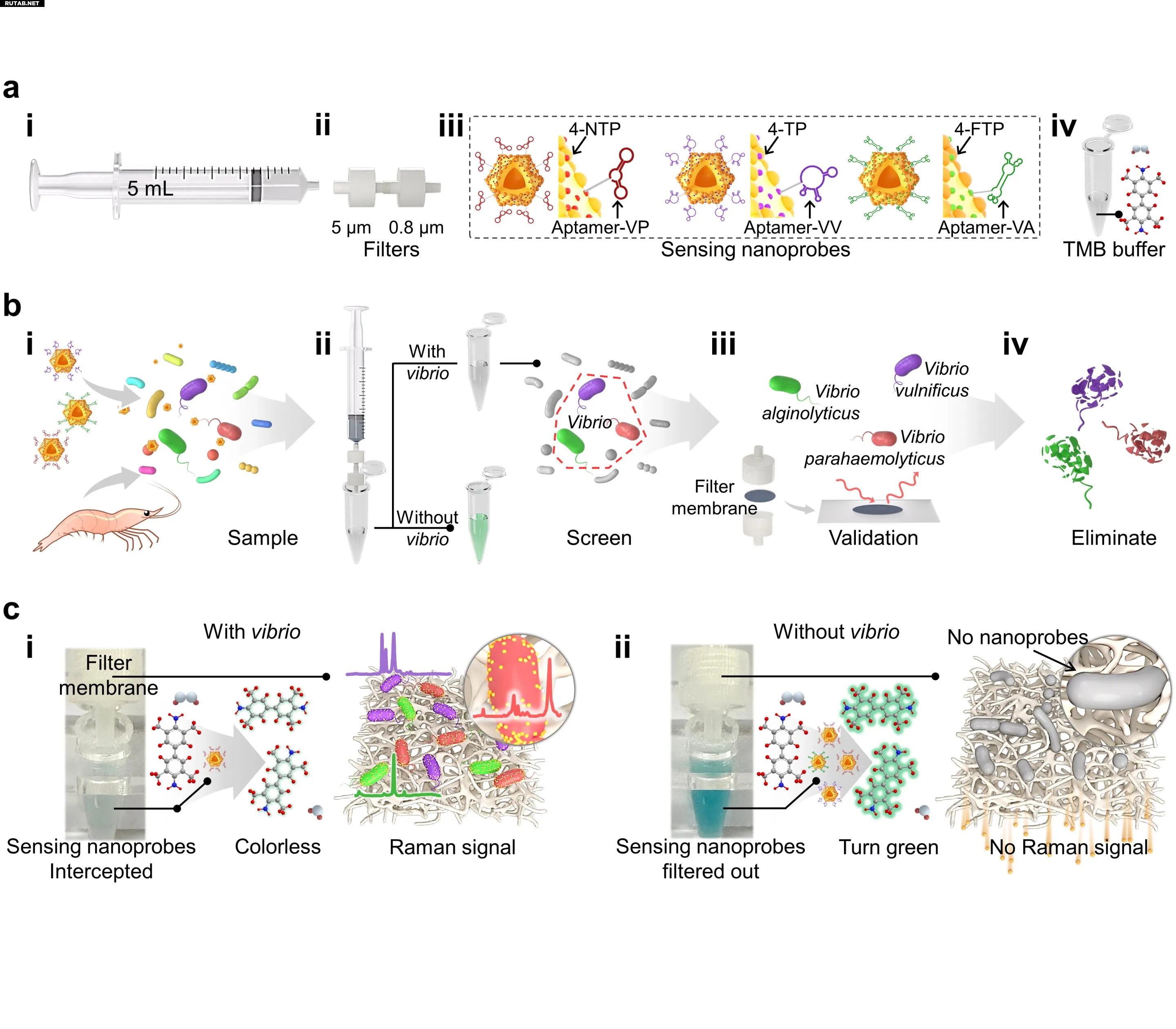 Используя тройную производительность ES-AuAgNPs и интегрируя модифицированный специфичный аптамерный зонд, исследовательская группа разработала портативную, модульную и сантиметрового размера платформу. Эта платформа способна одновременно проводить скрининг, валидацию и устранение трех пандемичных морских видов Vibrio: Vibrio parahaemolyticus, Vibrio vulnificus и Vibrio alginolyticus.